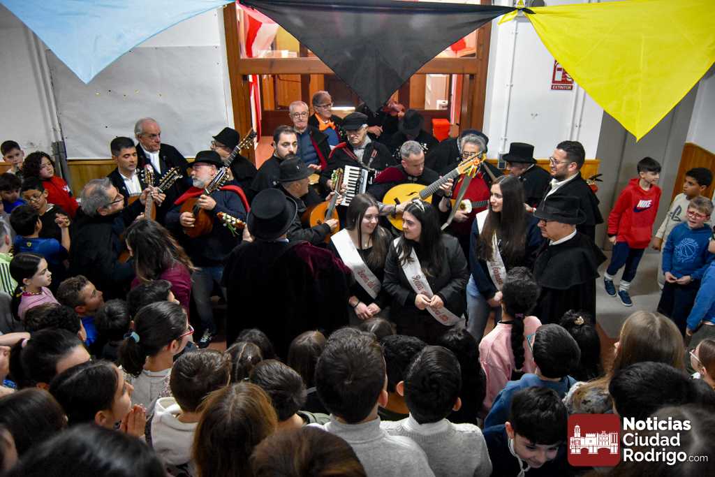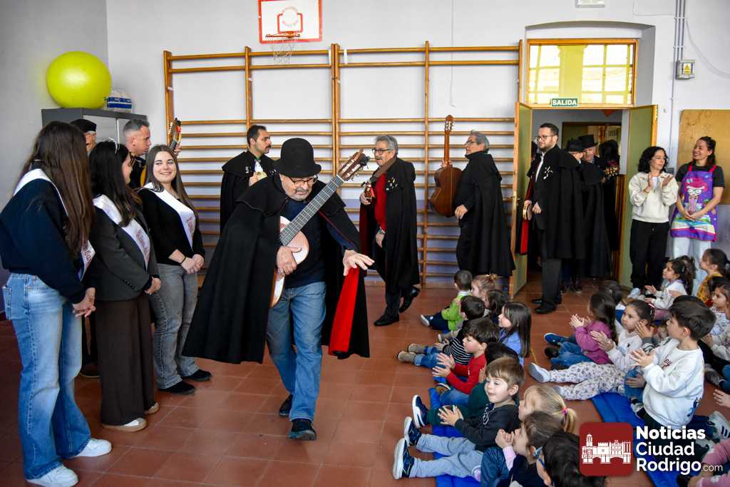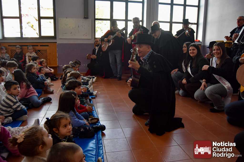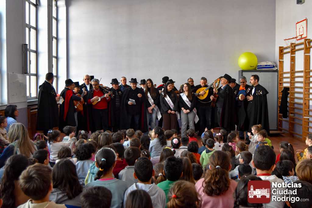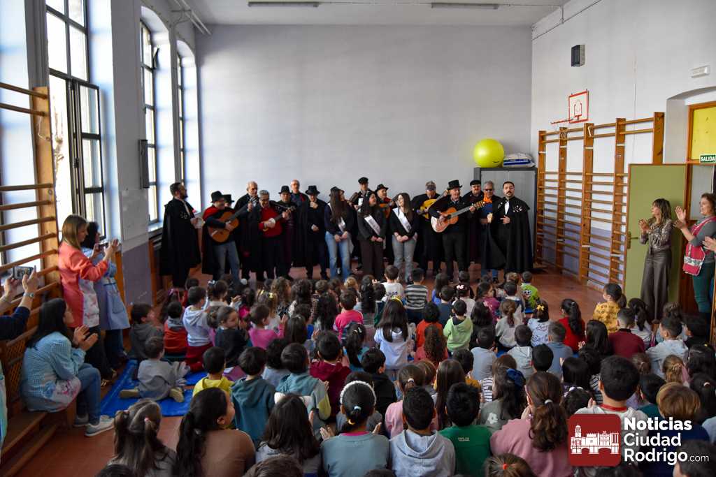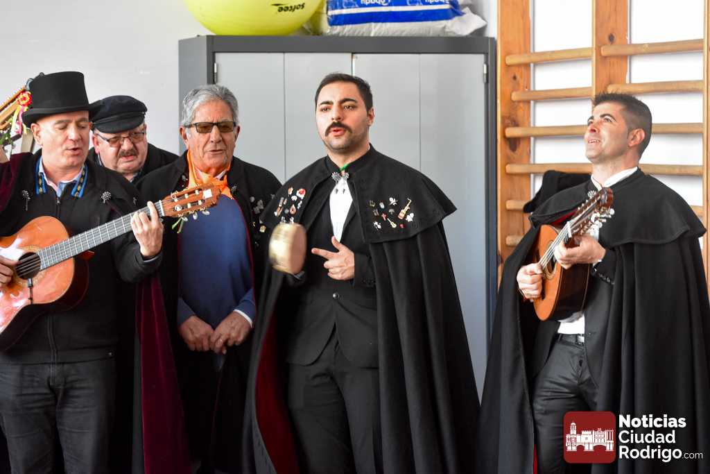 La Rondalla III Columnas realizó durante esta mañana su tradicional visita con motivo del Jueves de Casetas a los centros educativos mirobrigenses. Dicha «gira» la arrancó en el Colegio San Francisco, con una actuación por partida doble, iniciándose en el gimnasio con los cursos más pequeños que, a pesar de su edad, se sabían todas las canciones.