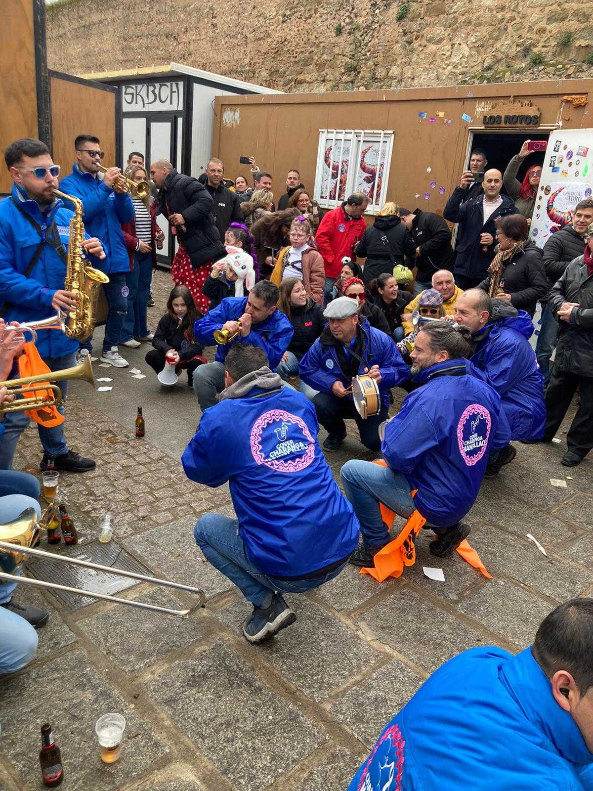 La jornada de fin de semana durante el Carnaval del Toro 2026 ha sido de muchos disfraces, algunos muy curiosos y otros que han protagonizado auténticos momentazos, como es el caso de la Peña SKBCH, que se animó a hacer un «cover» de la Charanga Manliao durante la tarde dominical. De esta forma la «Cover Charanga: Manpillao», bien ataviada, acabó incluso tocando con la «original» a las puertas de su peña.