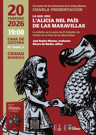 La editorial independiente Libros desde Tuma presentará este viernes, 20 de febrero, en Ciudad Rodrigo «Lo que jidu l’Alicia nel País de las Maravillas», la traducción a la palra de El Rebollar del clásico «Las aventuras de Alicia en el País de las Maravillas», de Lewis Carroll (1832-1898).