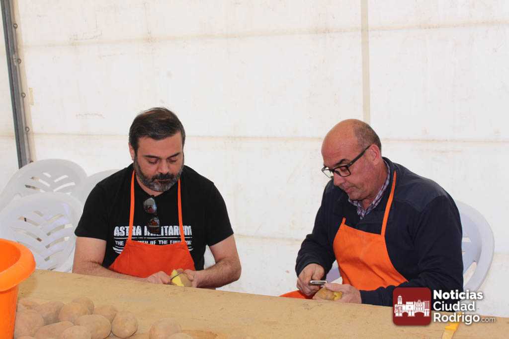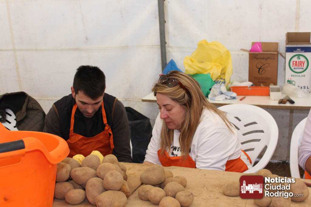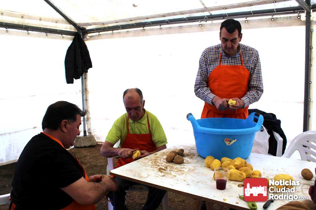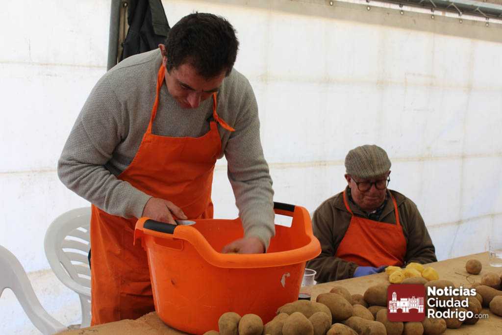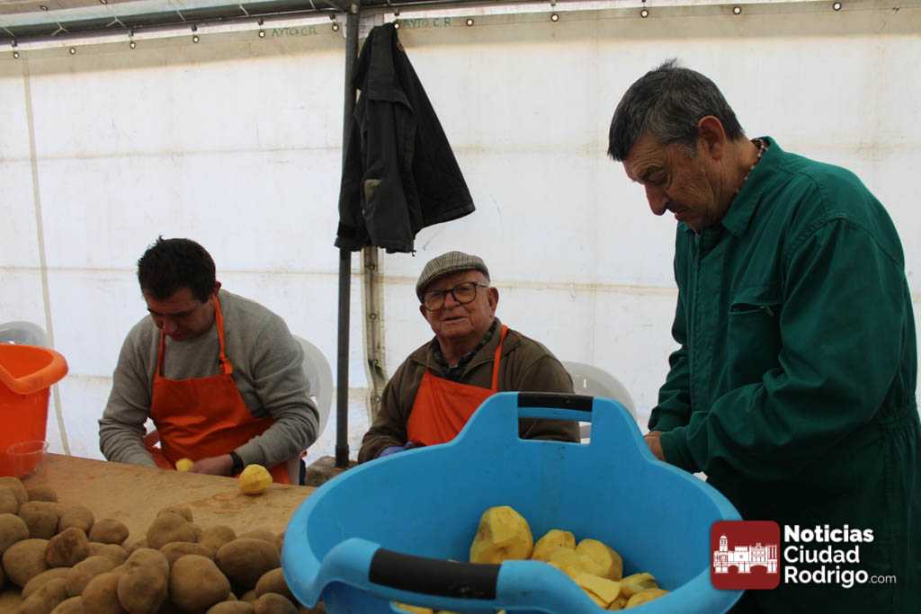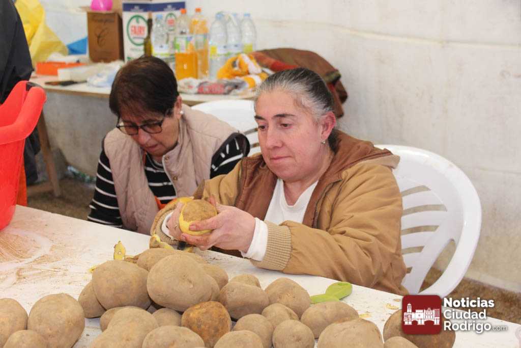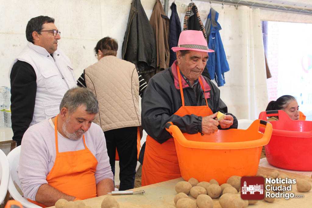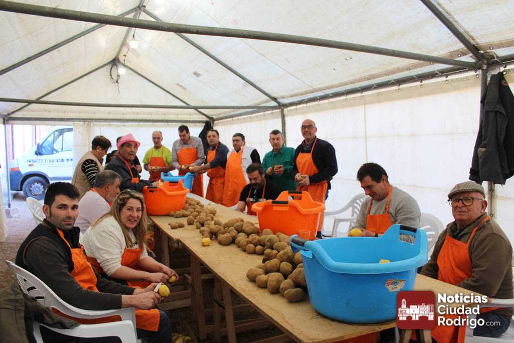 Bajo la dirección de José Benito, como es habitual, el equipo ha pelado 600 kilos de patatas, además de cebolla, ajo y otros ingredientes del guiso que mañana se servirá. Estas patatas estarán acompañadas por la carne de dos novillos del Domingo de Carnaval, unos 400 kilos de toro.