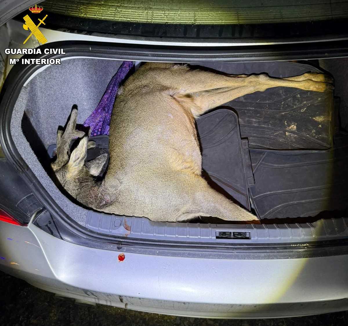 Al proceder a la inspección del vehículo sospechoso, los guardias civiles localizaron en el maletero una pieza abatida de Corzo macho, teniendo los cuernos con borra, pero de grandes dimensiones, estando totalmente prohibida su caza por encontrarse en época de veda.