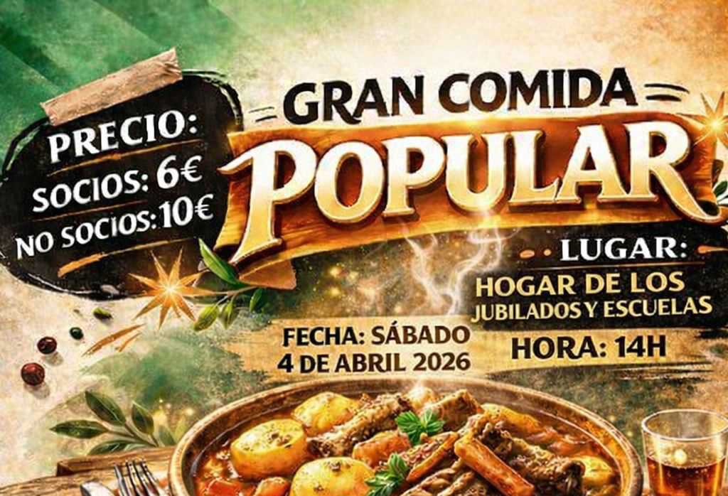 La comida se celebrará el sábado 4 de abril de 2026 a partir de las 14:00 h en el Hogar de los Jubilados y Escuelas. El menú consistirá en un plato de patatas con costilla, acompañado de bebida y postre. El precio del ticket será de 6 euros para los socios de la asociación y de 10 euros para los no socios. Además, con cada ticket de comida los participantes entrarán en el sorteo de una rifa que se celebrará durante la jornada.