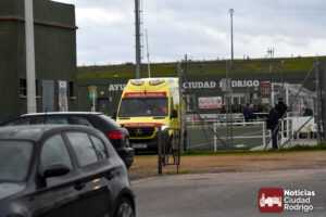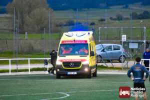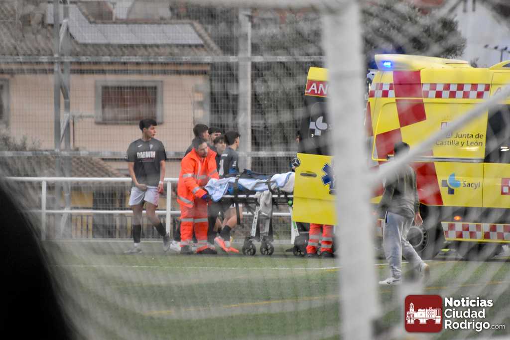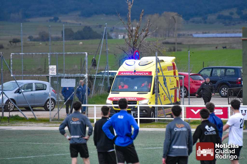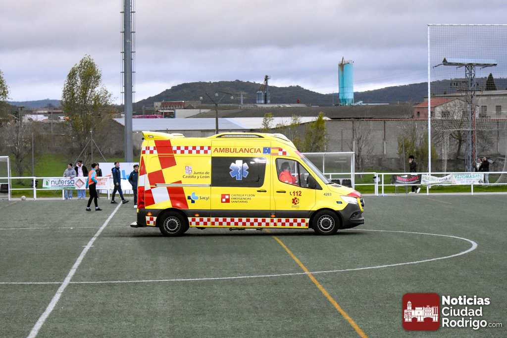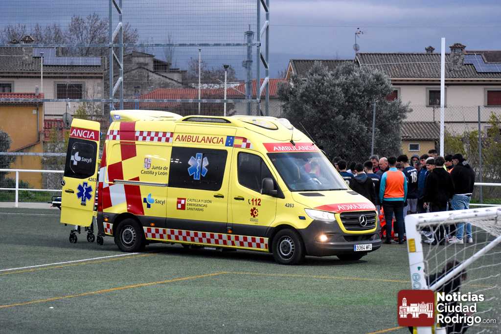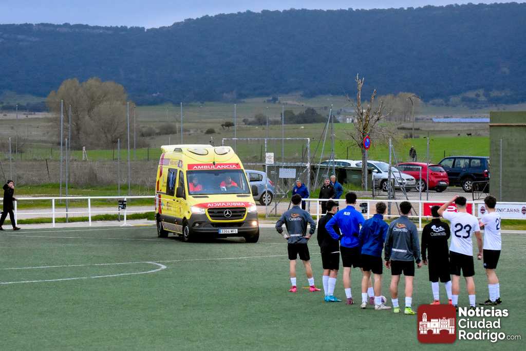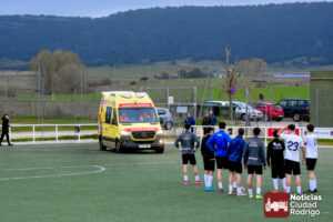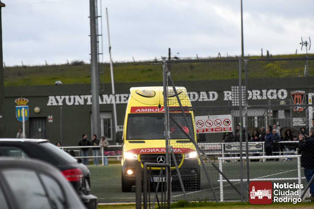 Esto conllevó la detención del encuentro durante al menos 20 minutos, interviniendo en primera instancia el banquillo visitante, aunque inmediatamente prestaron ayuda miembros del Ciudad Rodrigo CF, como fue el caso del enfermero y directivo del club, Manuel López del Val, que siempre está al quite en este tipo de situaciones; aunque finalmente tuvo que venir una ambulancia a las instalaciones. La cual dejó una muy llamativa «estampa» al entrar al terreno de juego por uno de los accesos destinados para ello.