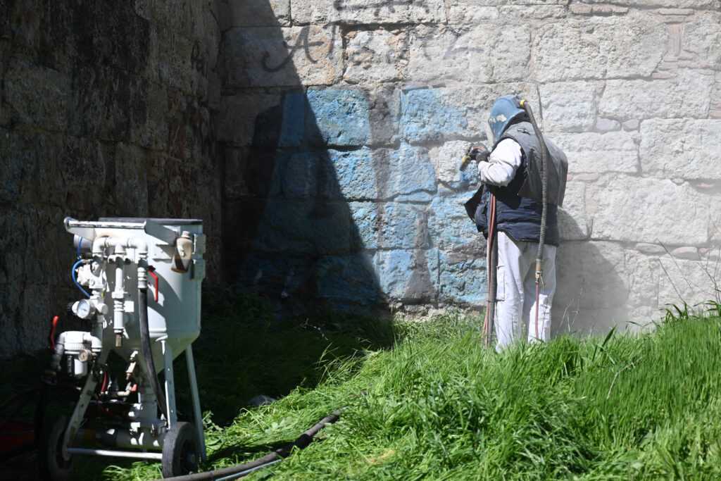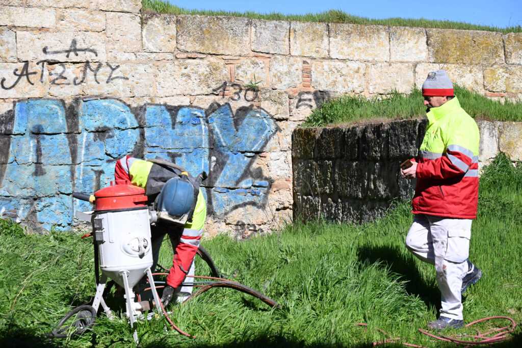 Una empresa especializada ha llevado a cabo en la mañana de este viernes labores de limpieza en distintos puntos del conjunto defensivo de la muralla tras la aparición reciente de varias pintadas. Para ello, se ha actuado mediante chorro de arena a alta presión, con el objetivo de eliminar dichos signos vandálicos realizados en este enclave histórico.
