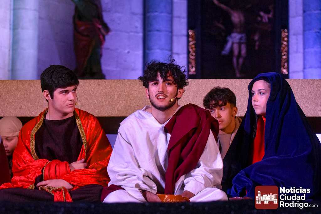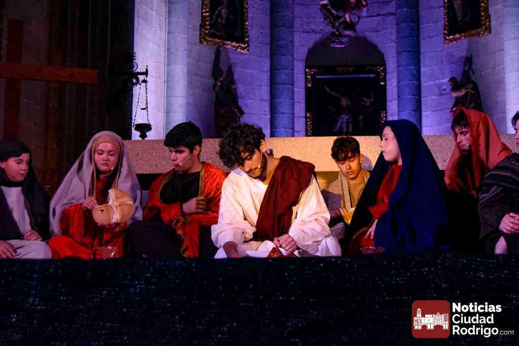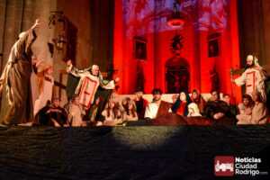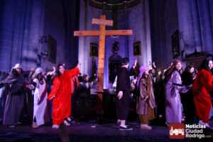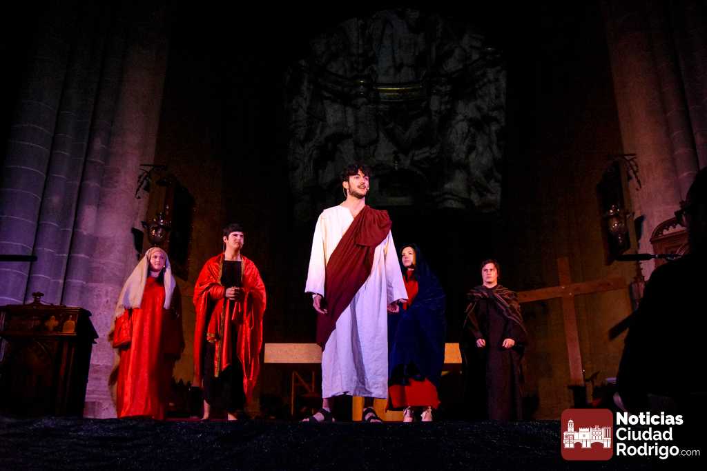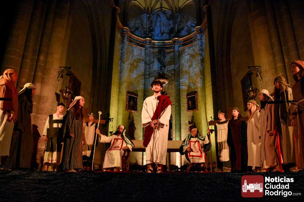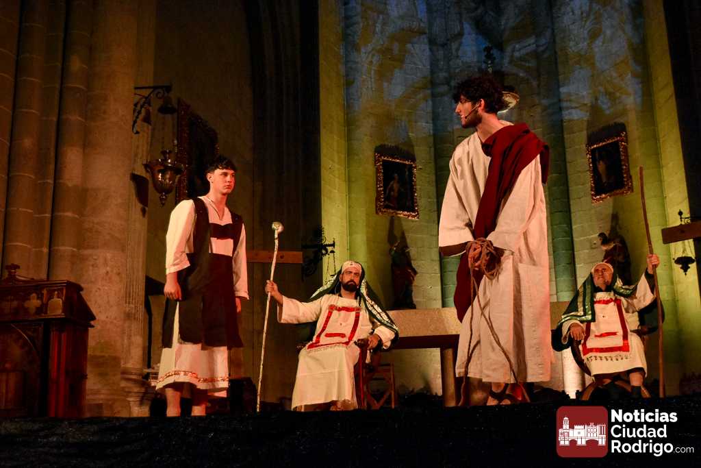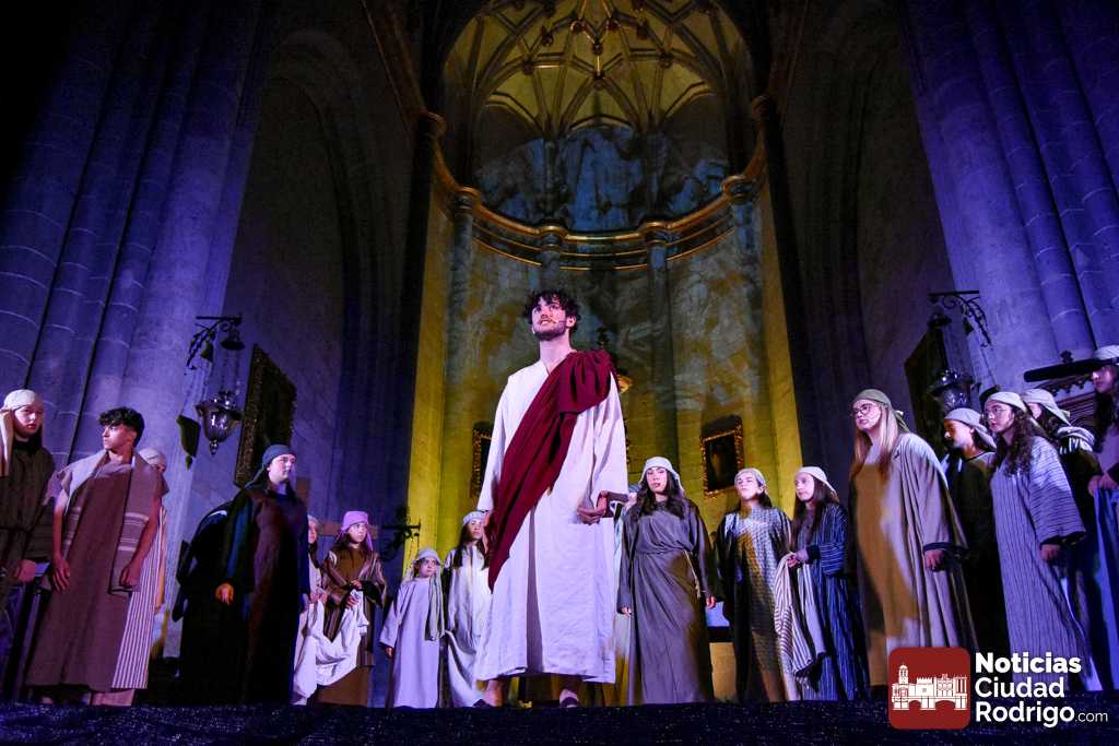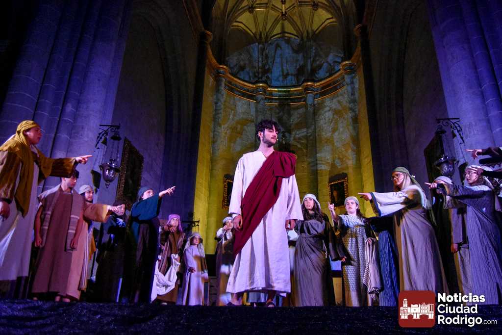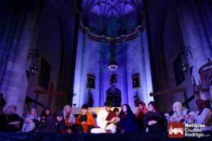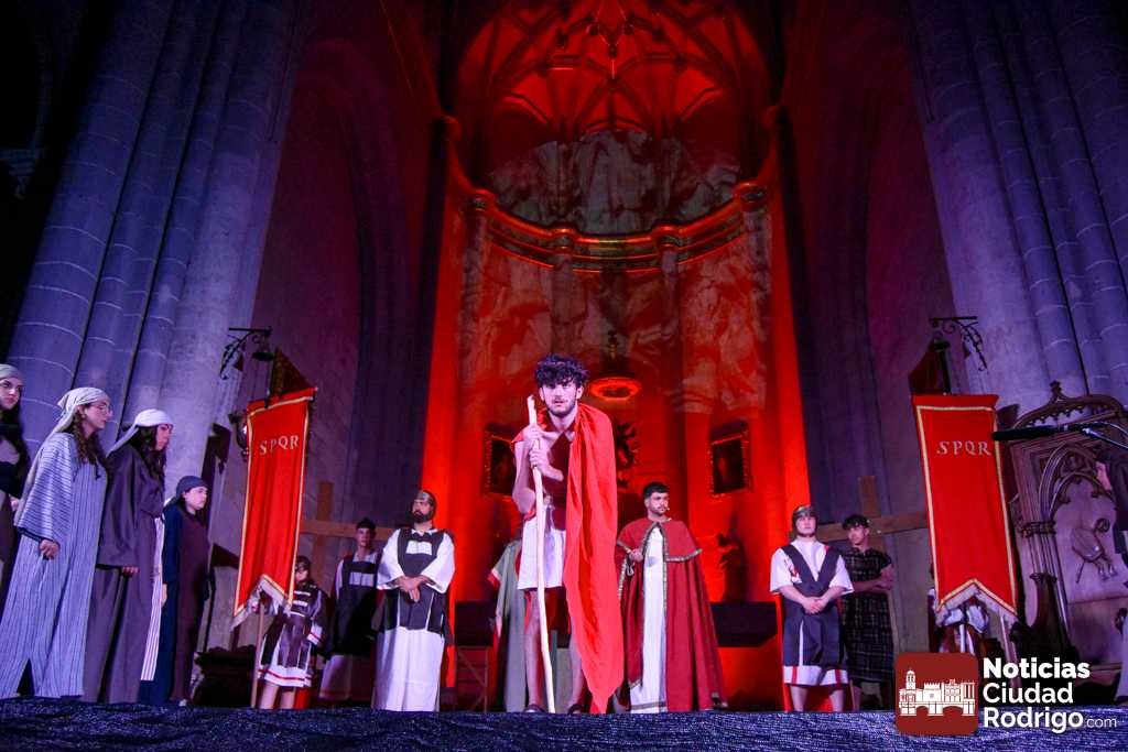 La Catedral de Ciudad Rodrigo acogió durante la noche de Lunes Santo uno de los «clásicos» de la Semana Santa mirobrigense como es la representación de La Pasión a cargo del Grupo El Manantial. Una cita que llenó el templo mirobrigense hasta los topes y que contó con una puesta en escena sobrecogedora (en el buen sentido de la palabra) y bien combinada con un trabajo a nivel de iluminación y sonido, que aprovecharon la oportunidad que ofrecía la propia Catedral como espacio escénico, lugar que no contaba con esta actuación desde hace justo una década.