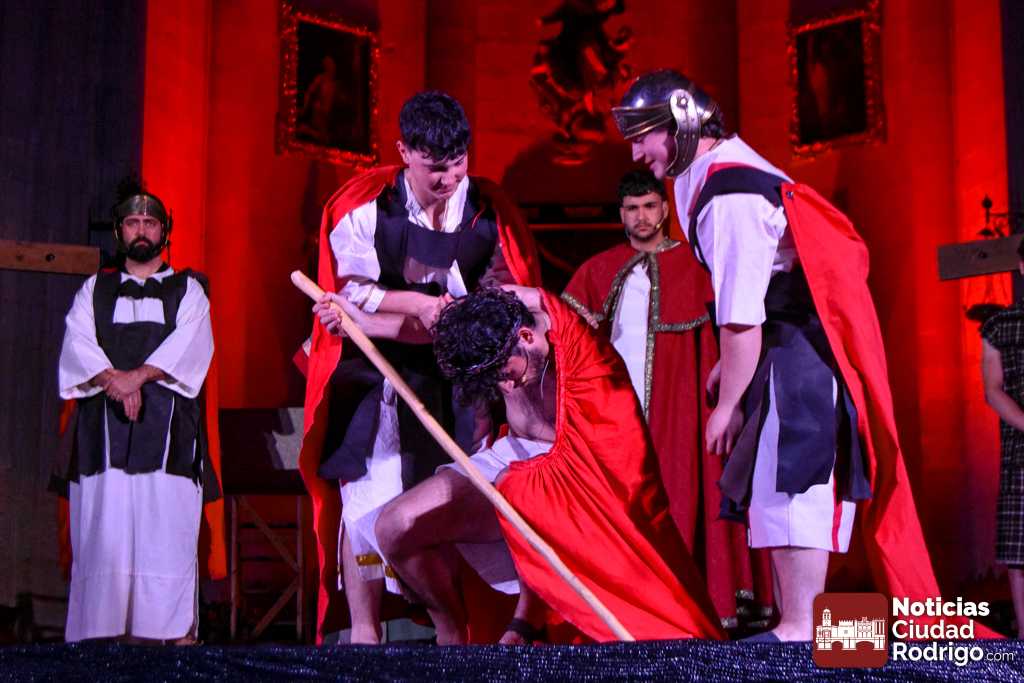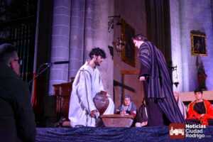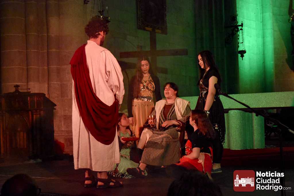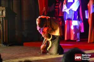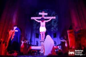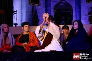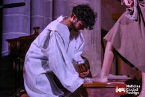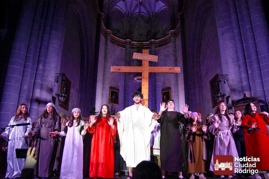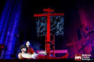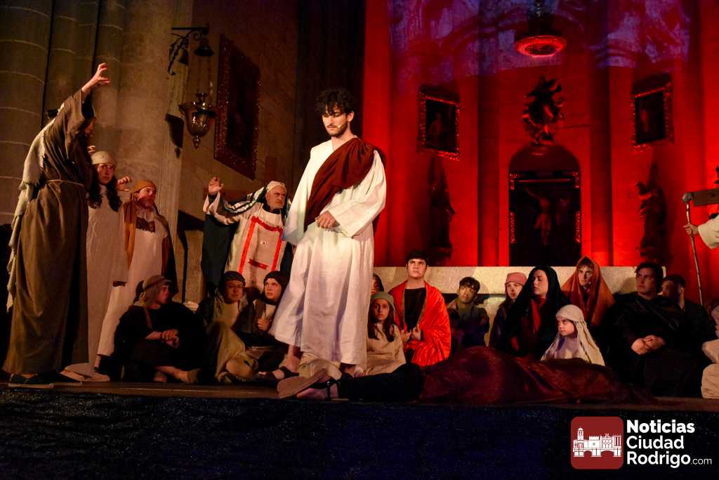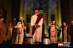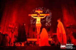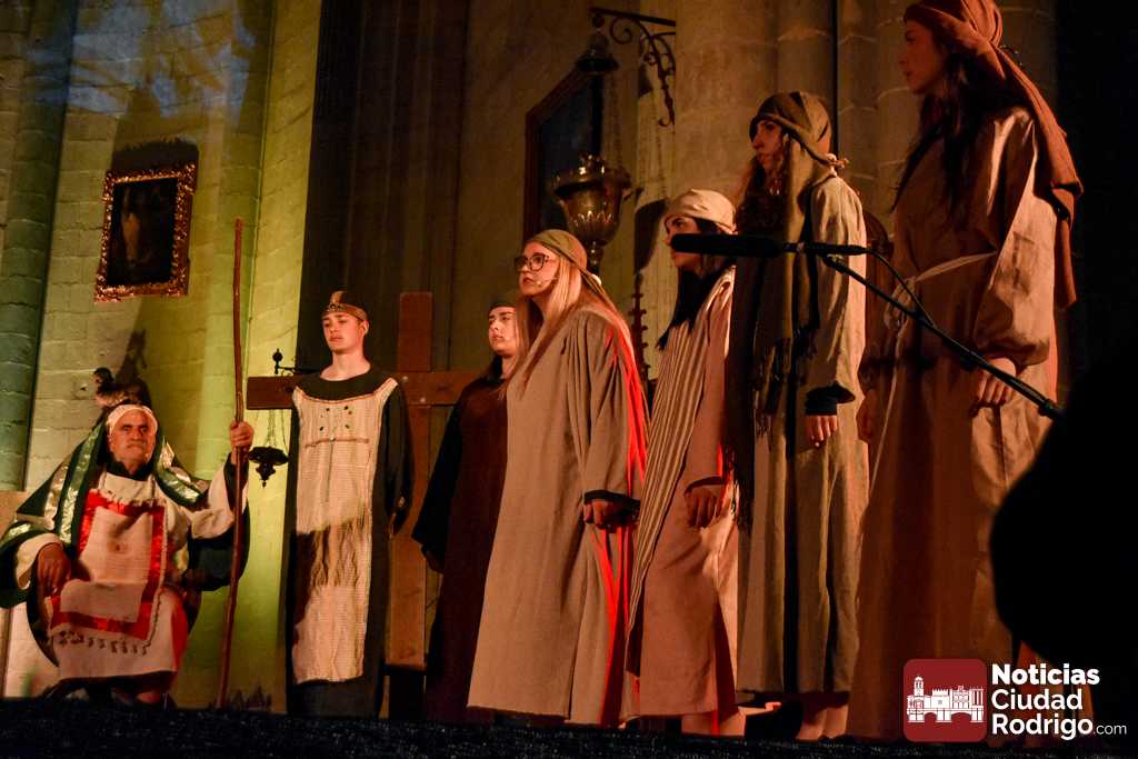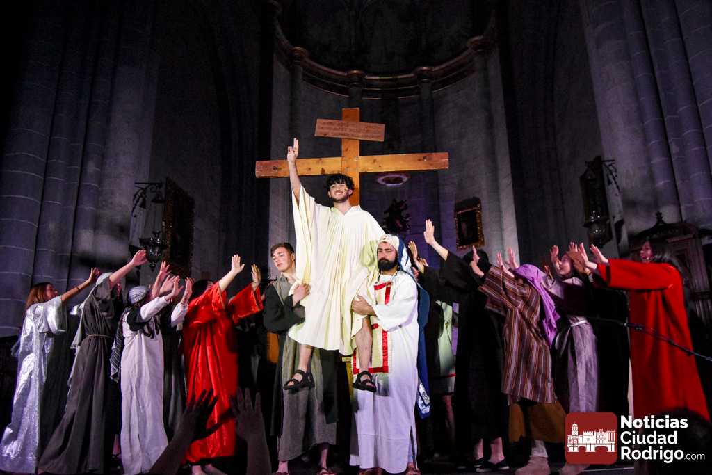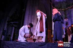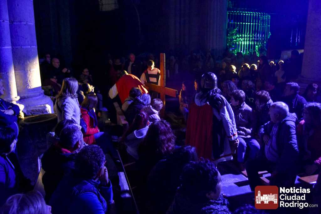 La Catedral de Ciudad Rodrigo acogió durante la noche de Lunes Santo uno de los «clásicos» de la Semana Santa mirobrigense como es la representación de La Pasión a cargo del Grupo El Manantial. Una cita que llenó el templo mirobrigense hasta los topes y que contó con una puesta en escena sobrecogedora (en el buen sentido de la palabra) y bien combinada con un trabajo a nivel de iluminación y sonido, que aprovecharon la oportunidad que ofrecía la propia Catedral como espacio escénico, lugar que no contaba con esta actuación desde hace justo una década.