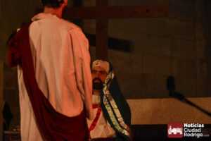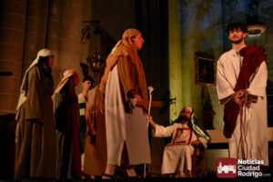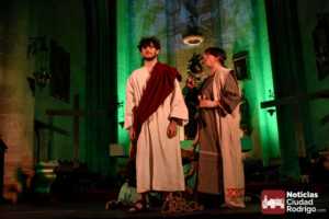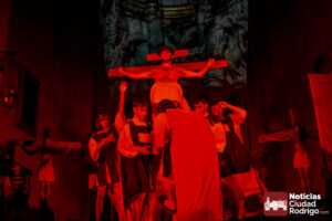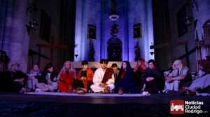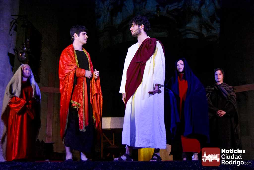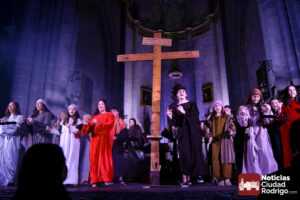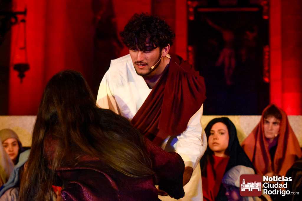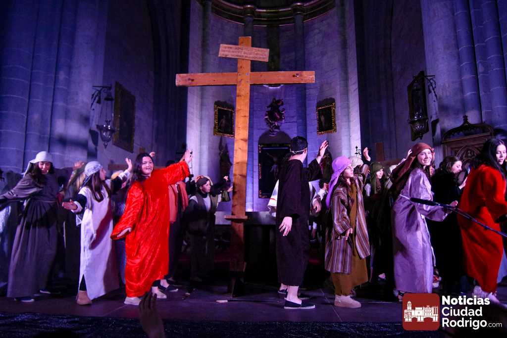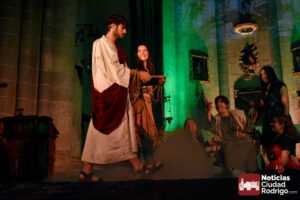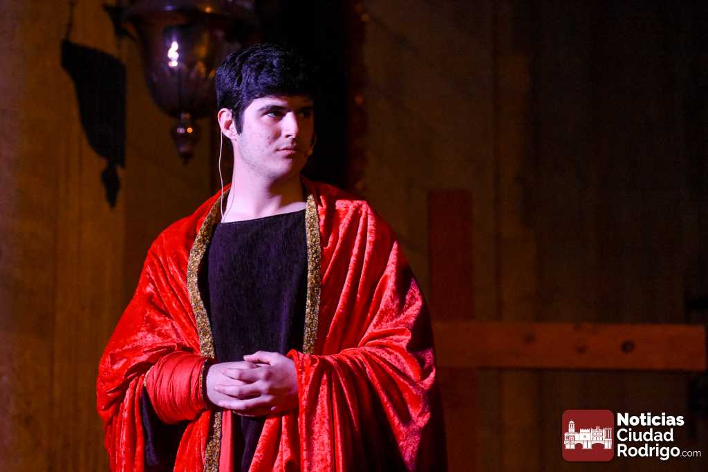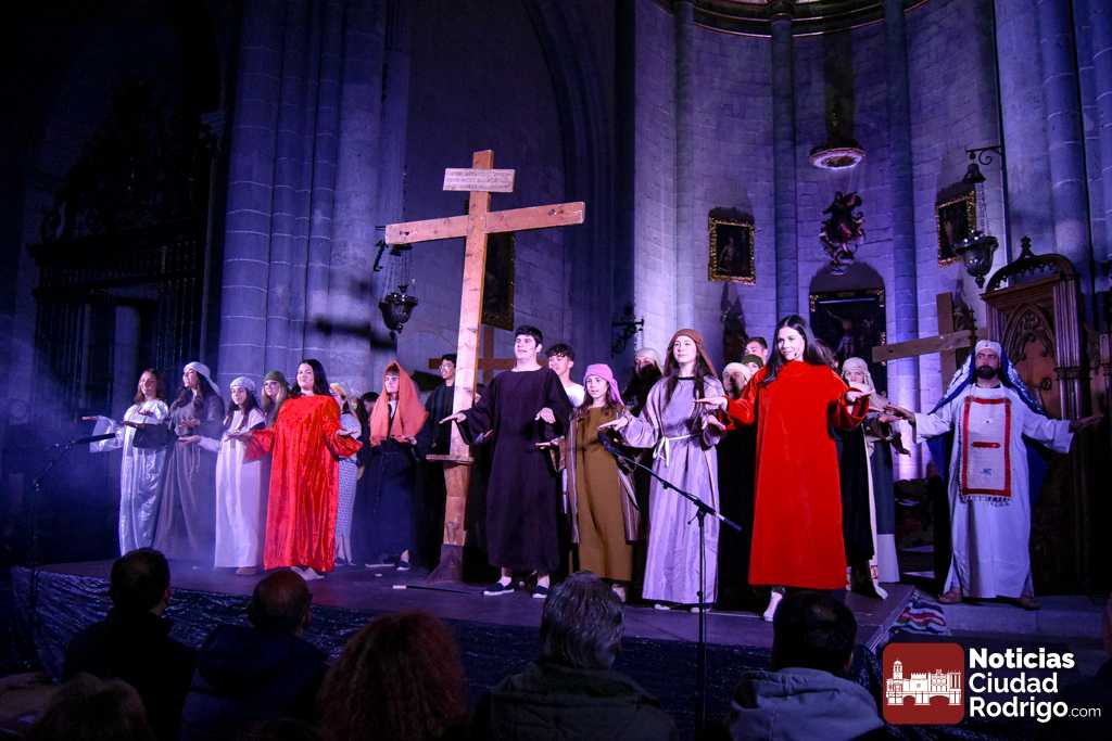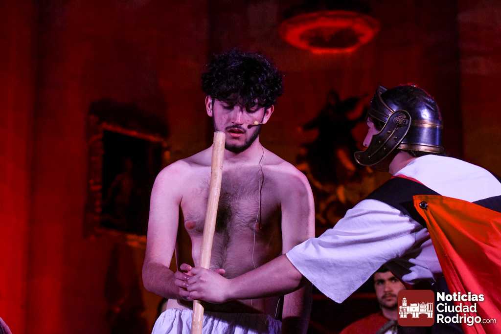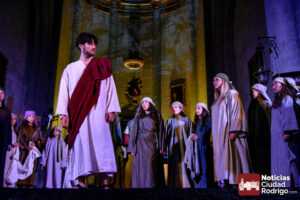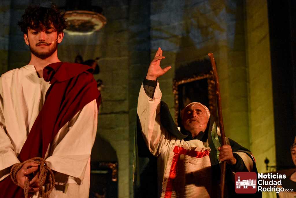 La Catedral de Ciudad Rodrigo acogió durante la noche de Lunes Santo uno de los «clásicos» de la Semana Santa mirobrigense como es la representación de La Pasión a cargo del Grupo El Manantial. Una cita que llenó el templo mirobrigense hasta los topes y que contó con una puesta en escena sobrecogedora (en el buen sentido de la palabra) y bien combinada con un trabajo a nivel de iluminación y sonido, que aprovecharon la oportunidad que ofrecía la propia Catedral como espacio escénico, lugar que no contaba con esta actuación desde hace justo una década.