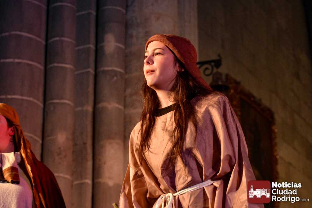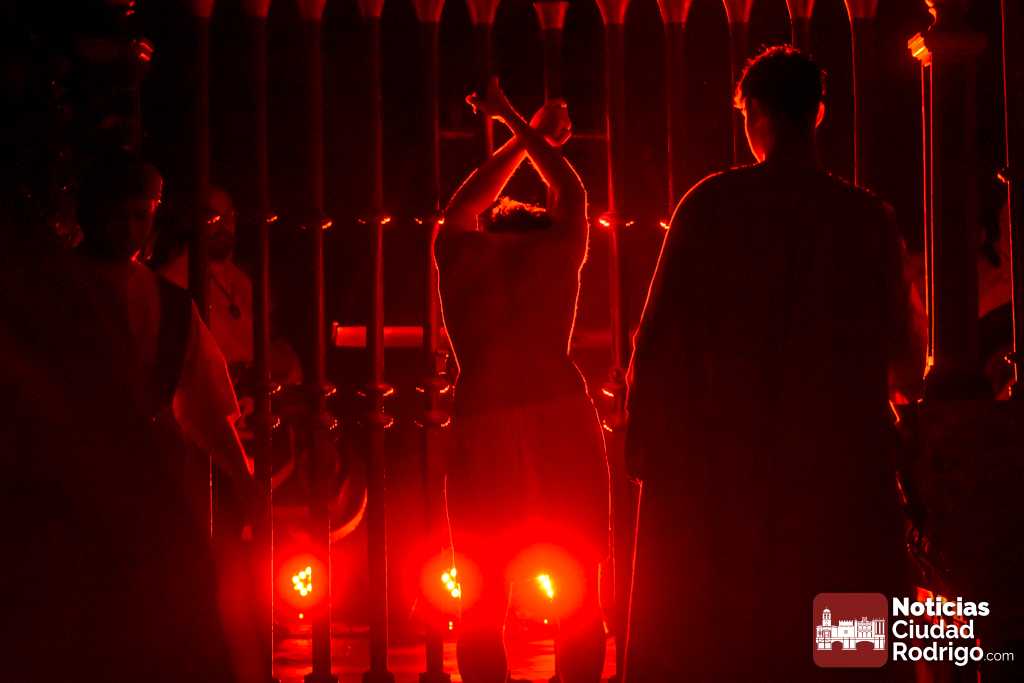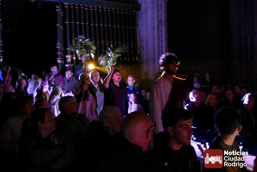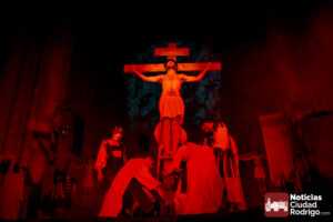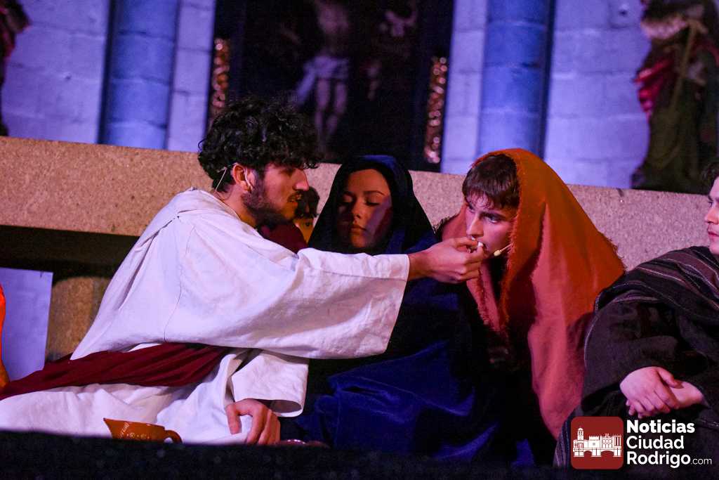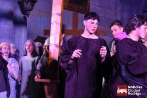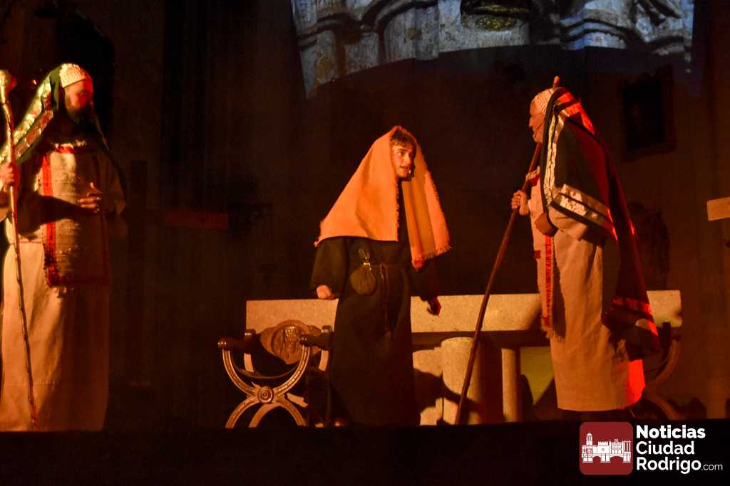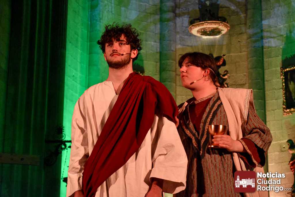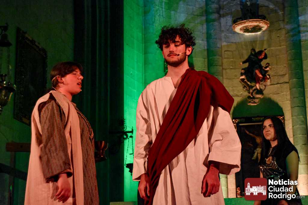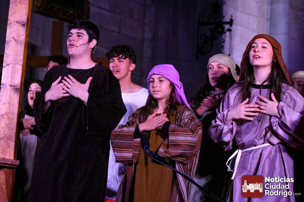 La Catedral de Ciudad Rodrigo acogió durante la noche de Lunes Santo uno de los «clásicos» de la Semana Santa mirobrigense como es la representación de La Pasión a cargo del Grupo El Manantial. Una cita que llenó el templo mirobrigense hasta los topes y que contó con una puesta en escena sobrecogedora (en el buen sentido de la palabra) y bien combinada con un trabajo a nivel de iluminación y sonido, que aprovecharon la oportunidad que ofrecía la propia Catedral como espacio escénico, lugar que no contaba con esta actuación desde hace justo una década.