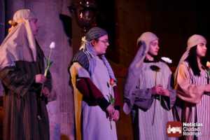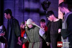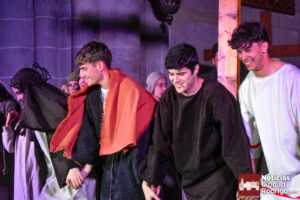 La actuación en sí estuvo cargada por la emoción y una puesta en escena lograda y con personalidad, llamando la atención del numeroso público, que aplaudió varias intervenciones. Llamativo fue el uso (un año más) de las zonas más elevadas, siendo uno de ellos el conocido como «Coro de las Viudas». El cierre de la representación contó con un número musical coreografiado, finalizando el evento con una foto grupal. Tras la obra se comentó por parte de los actuantes acerca de la presencia de un stand de venta con diferentes productos para recaudar fondos de cara a una iniciativa reciente denominada «Retiros de Samuel».
