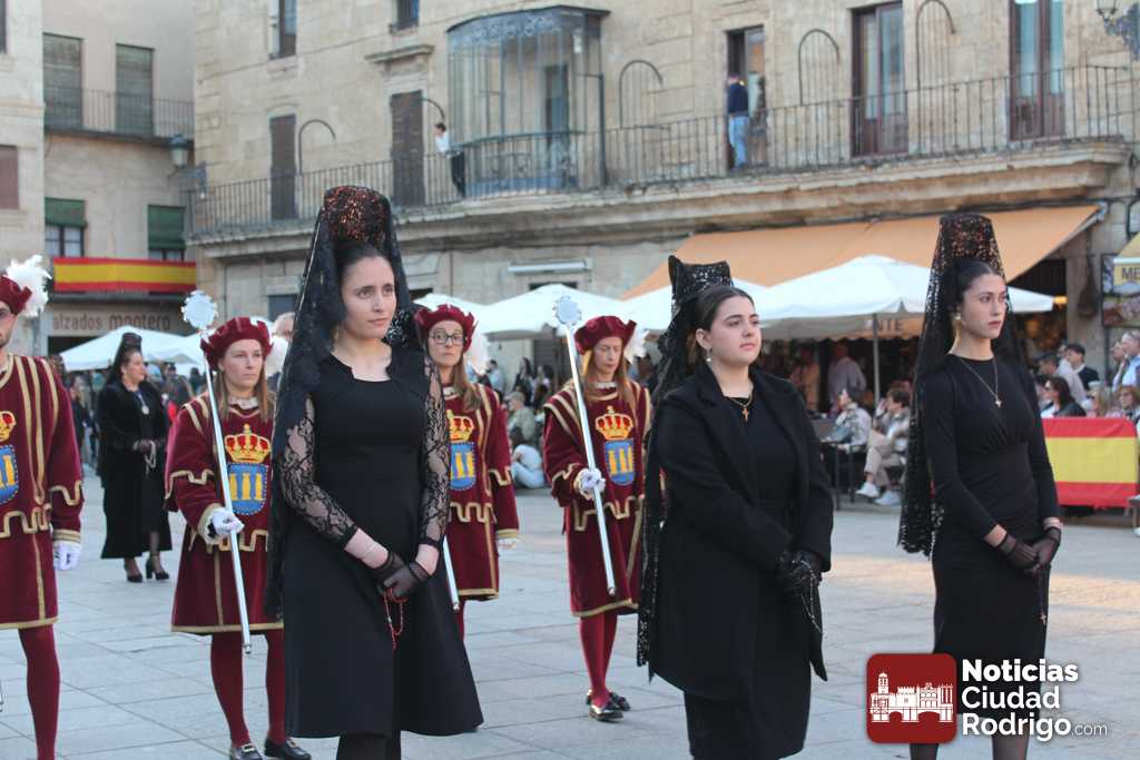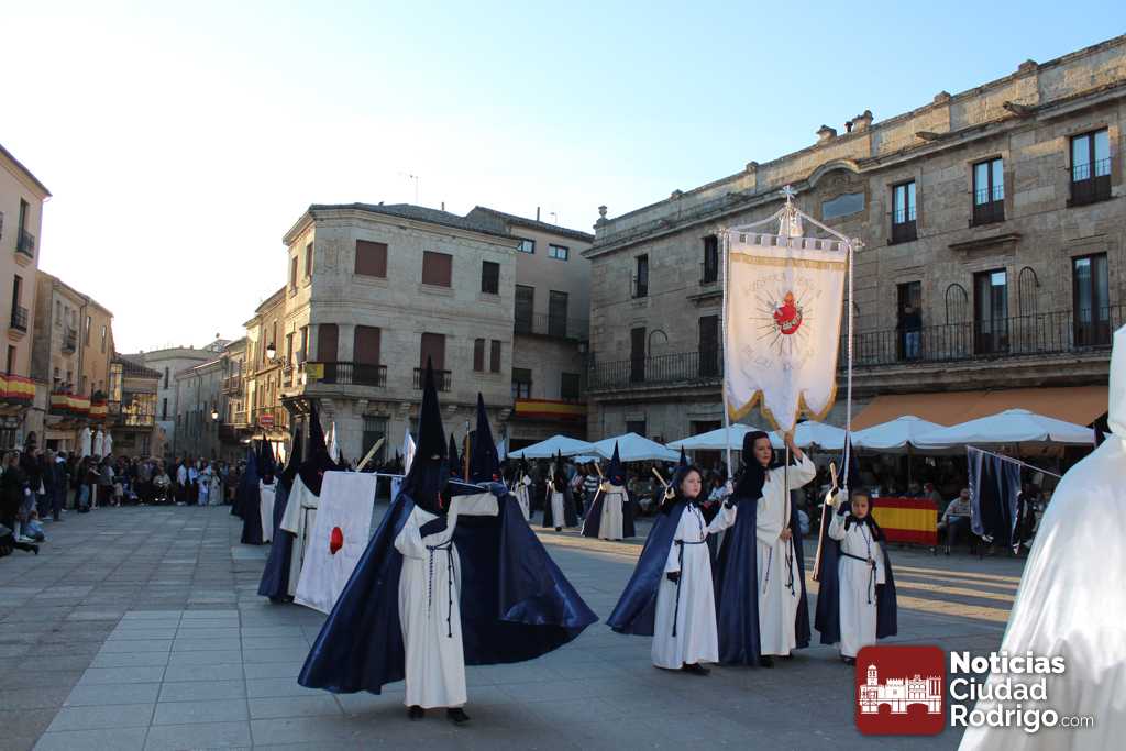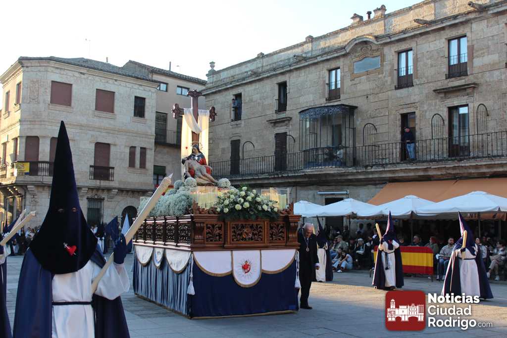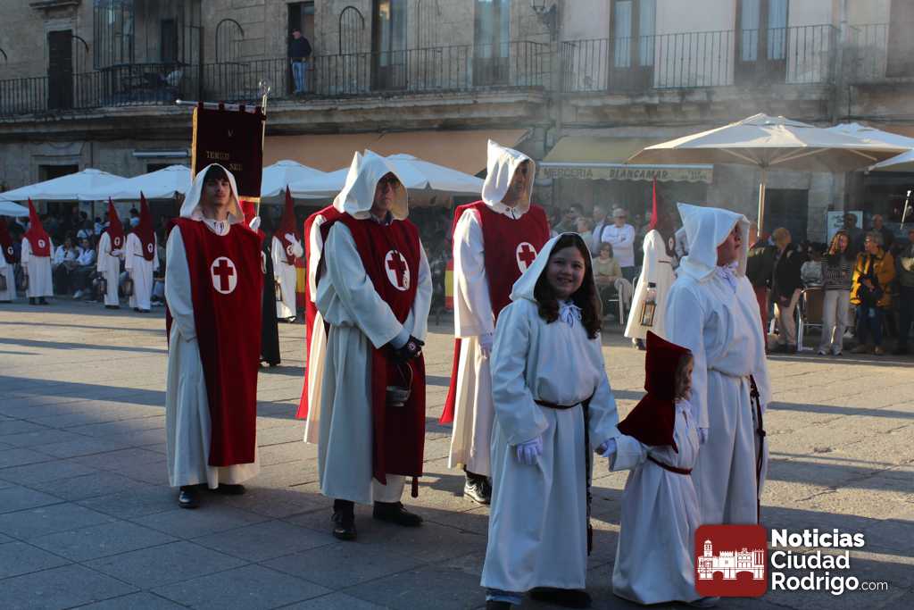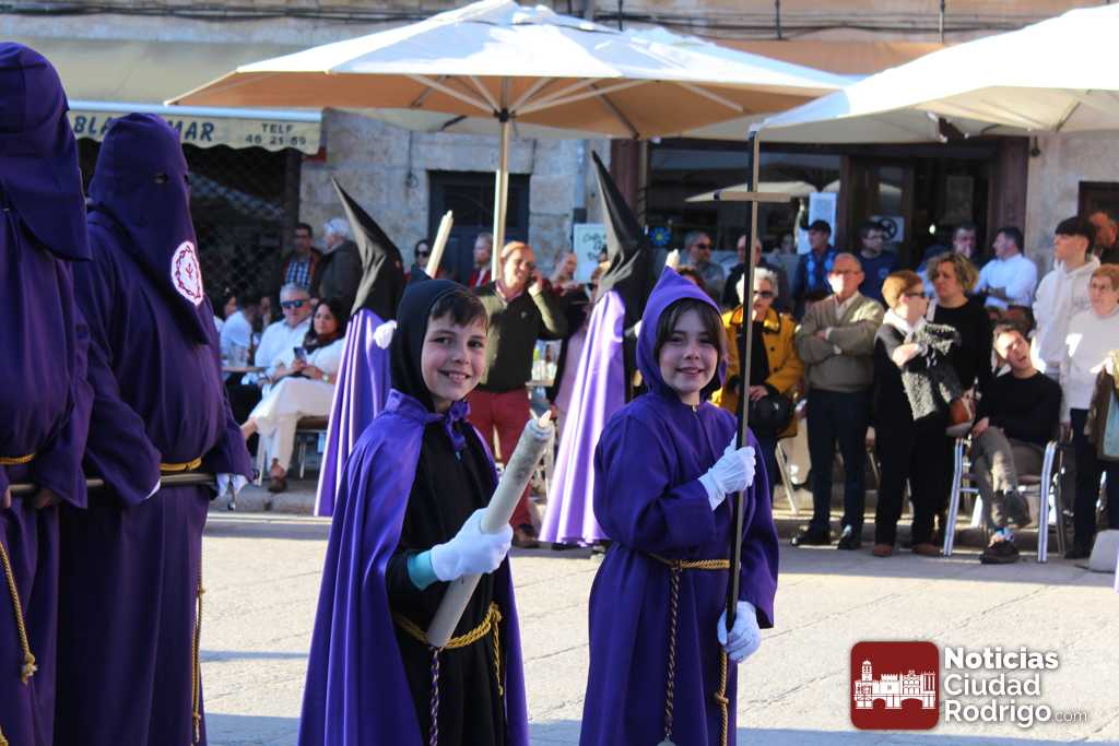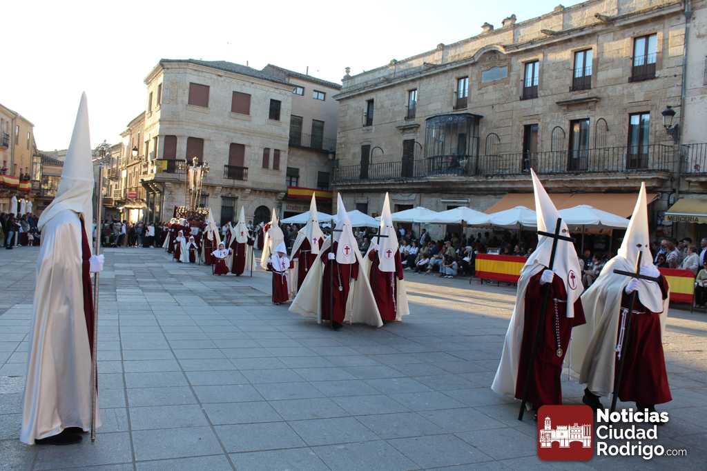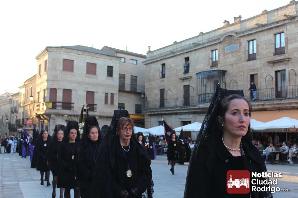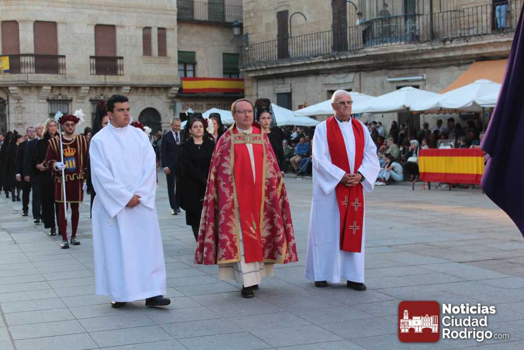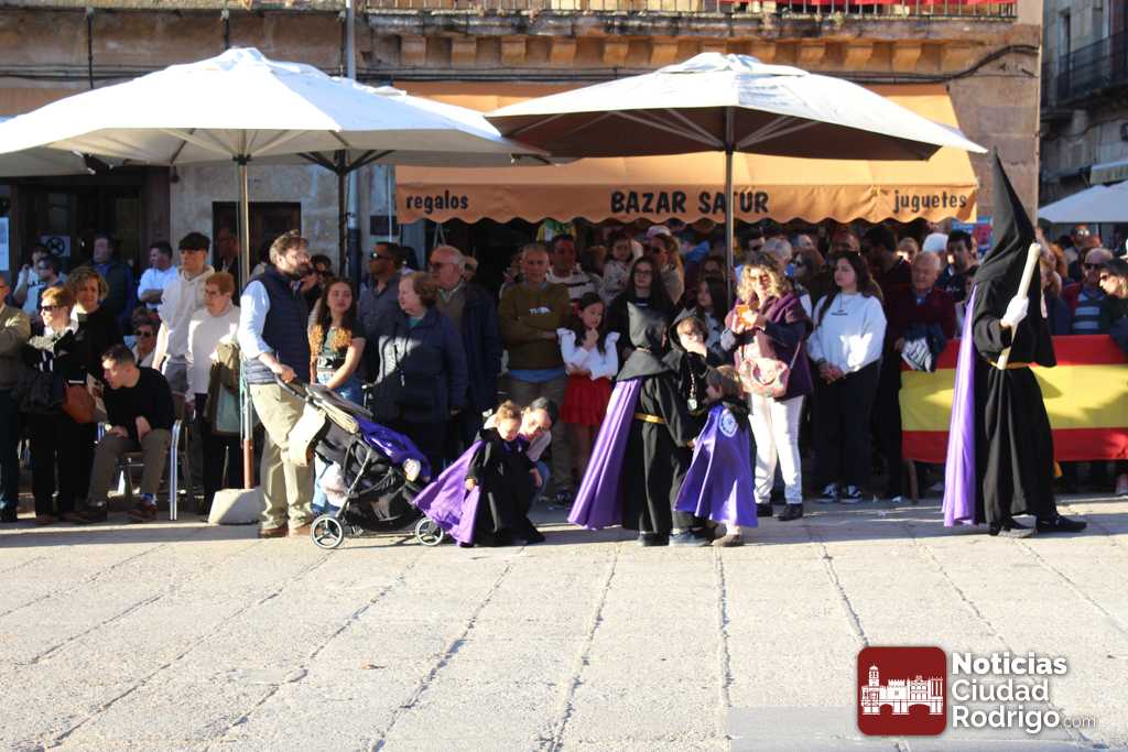La procesión del Santo Entierro es el punto culmen de la Semana Santa en Ciudad Rodrigo. Todas las procesiones participan en este recorrido que ha comenzado a las siete de la tarde en la Catedral civitatense. La imagen de La Borriquilla acompañada por la Cofradía Jesús Amigo de los Niños ha abierto la comitiva. La cofradía de la Oración del Huerto se ha unido a la altura de Cerralbo y después de forma directa, a diferencia de años anteriores, han ido por la calle Cardenal Pacheco a la plaza Mayor.