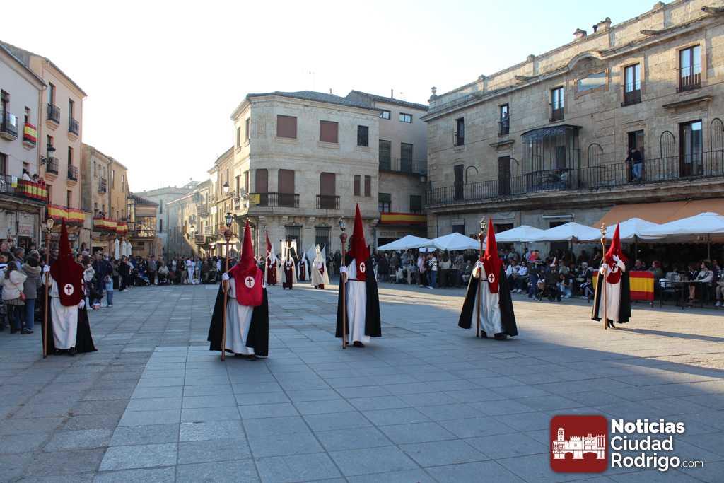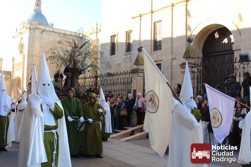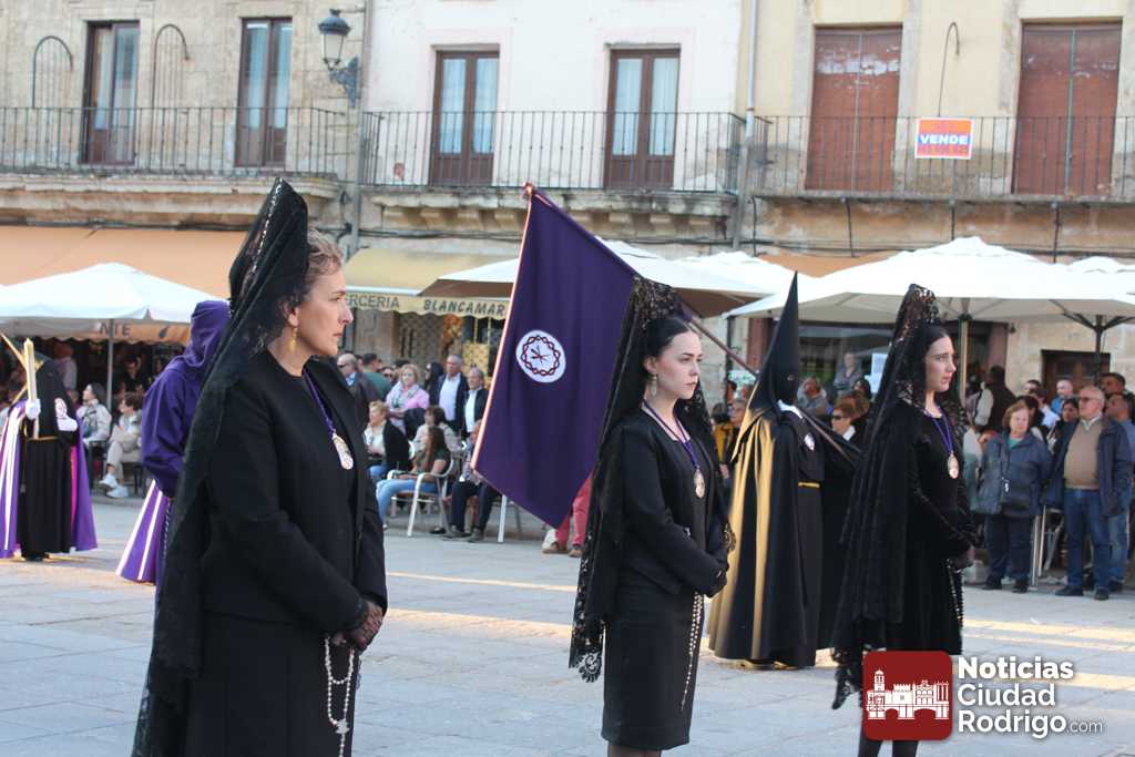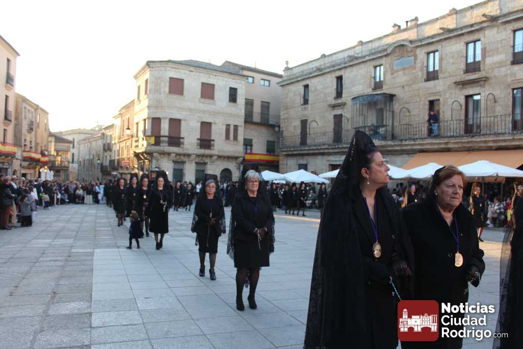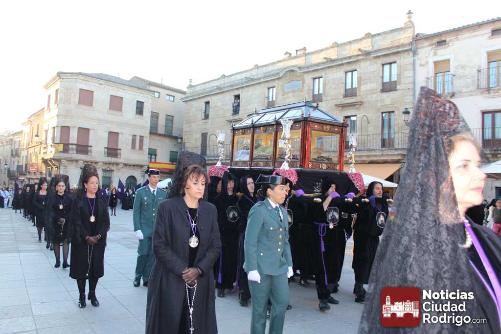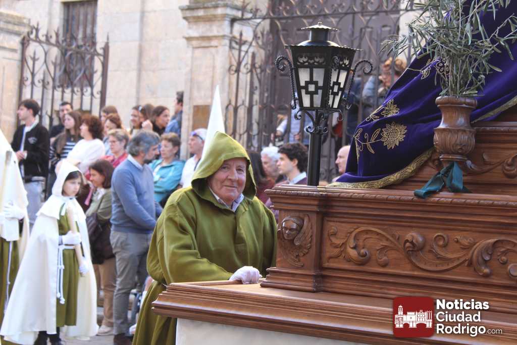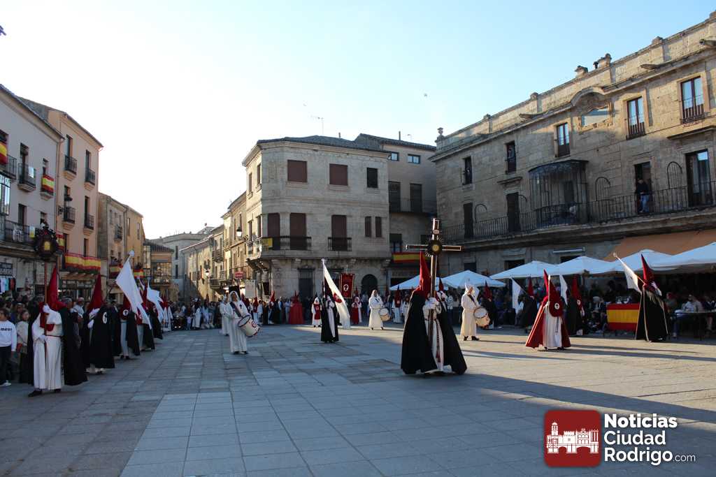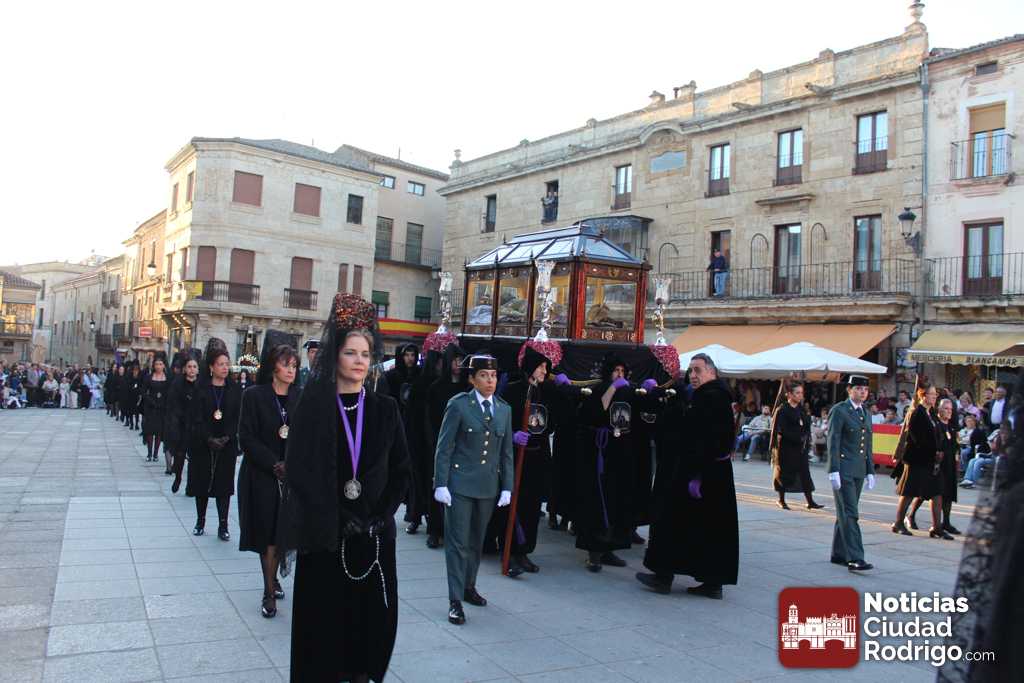 La procesión del Santo Entierro es el punto culmen de la Semana Santa en Ciudad Rodrigo. Todas las procesiones participan en este recorrido que ha comenzado a las siete de la tarde en la Catedral civitatense. La imagen de La Borriquilla acompañada por la Cofradía Jesús Amigo de los Niños ha abierto la comitiva. La cofradía de la Oración del Huerto se ha unido a la altura de Cerralbo y después de forma directa, a diferencia de años anteriores, han ido por la calle Cardenal Pacheco a la plaza Mayor.
