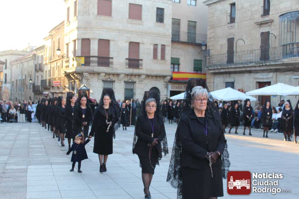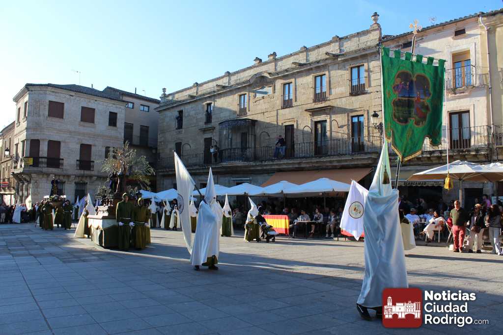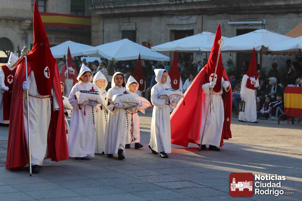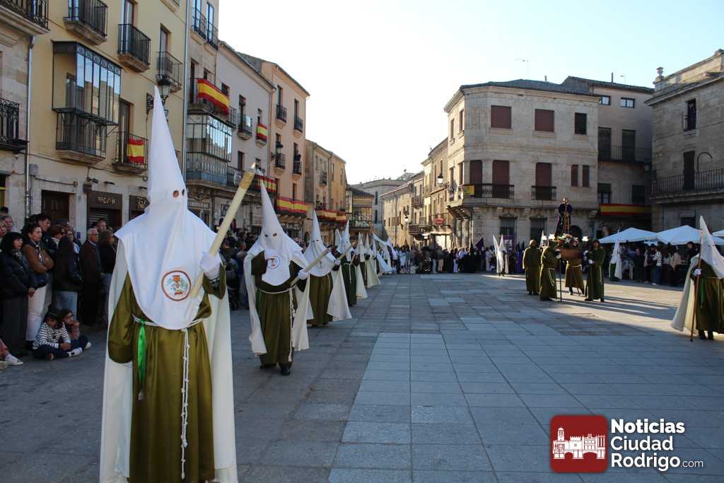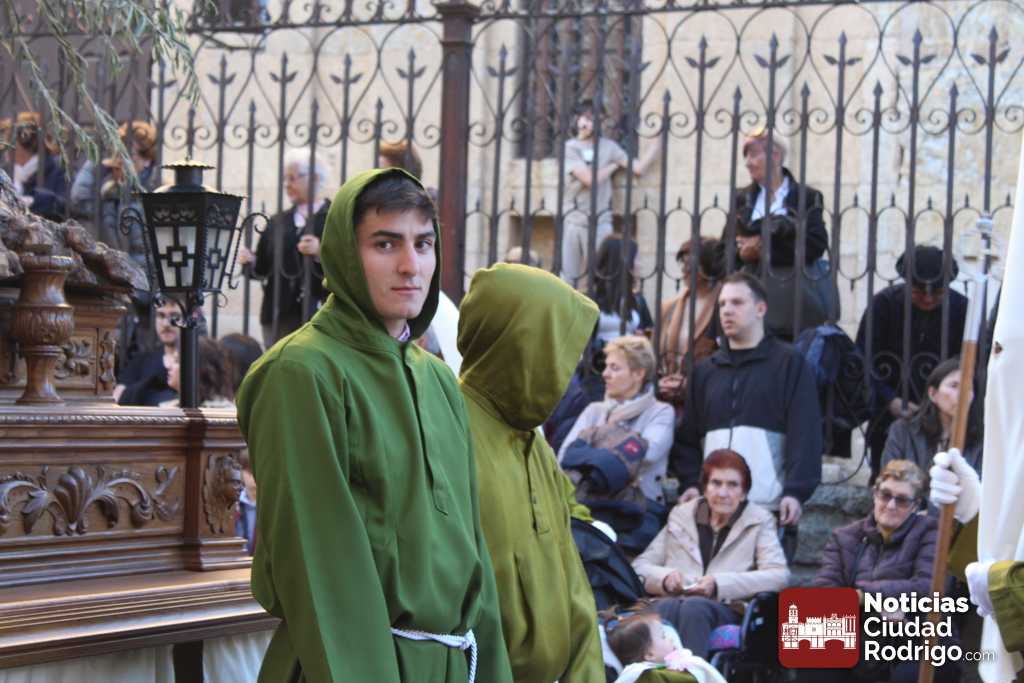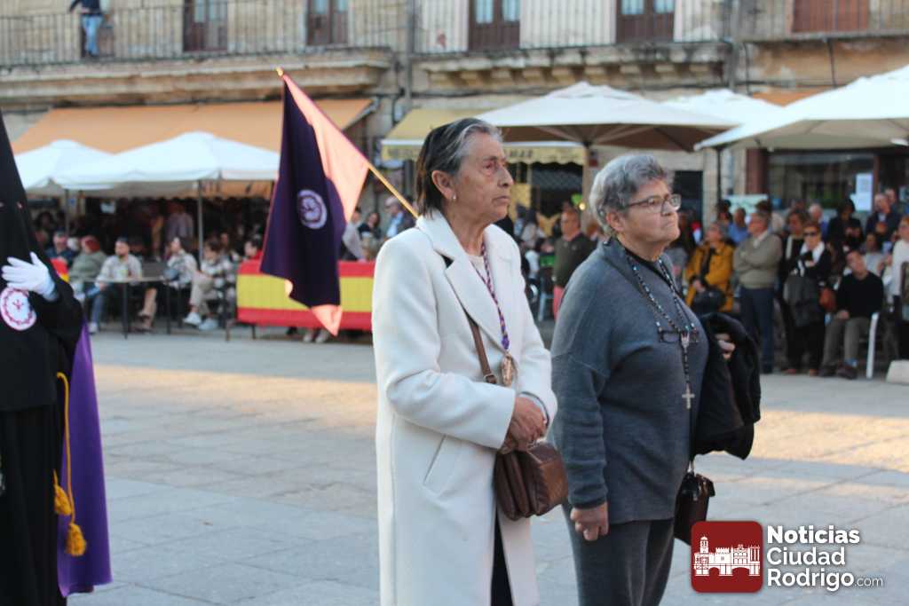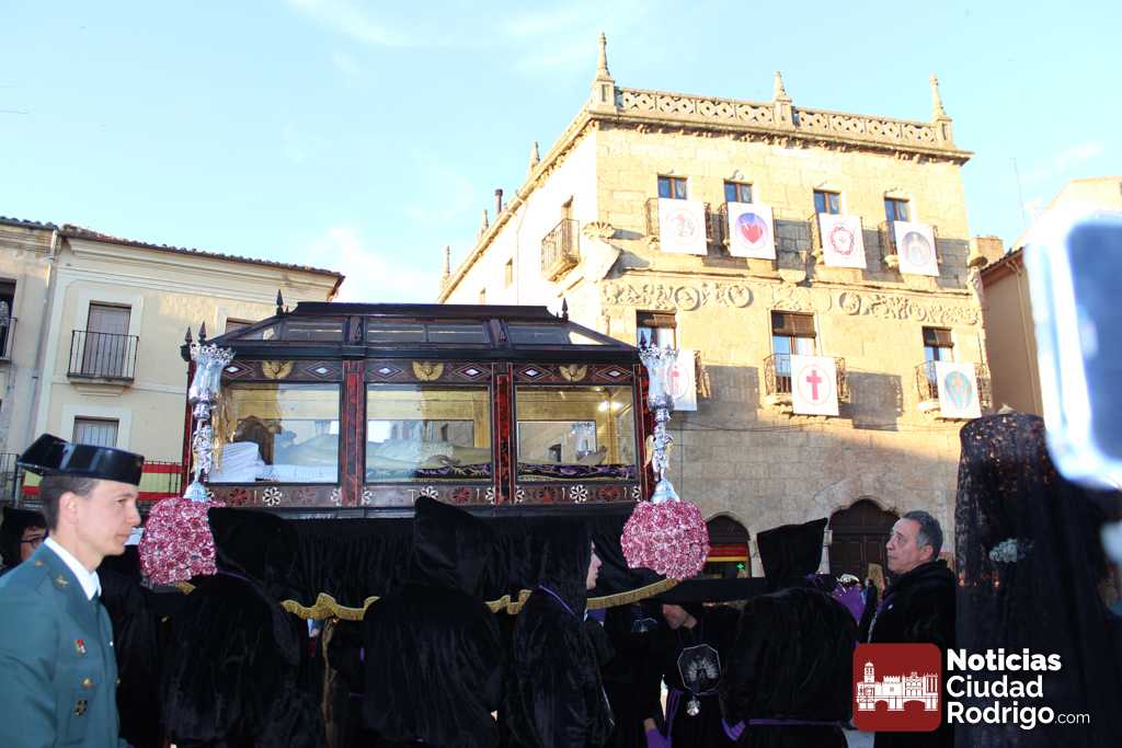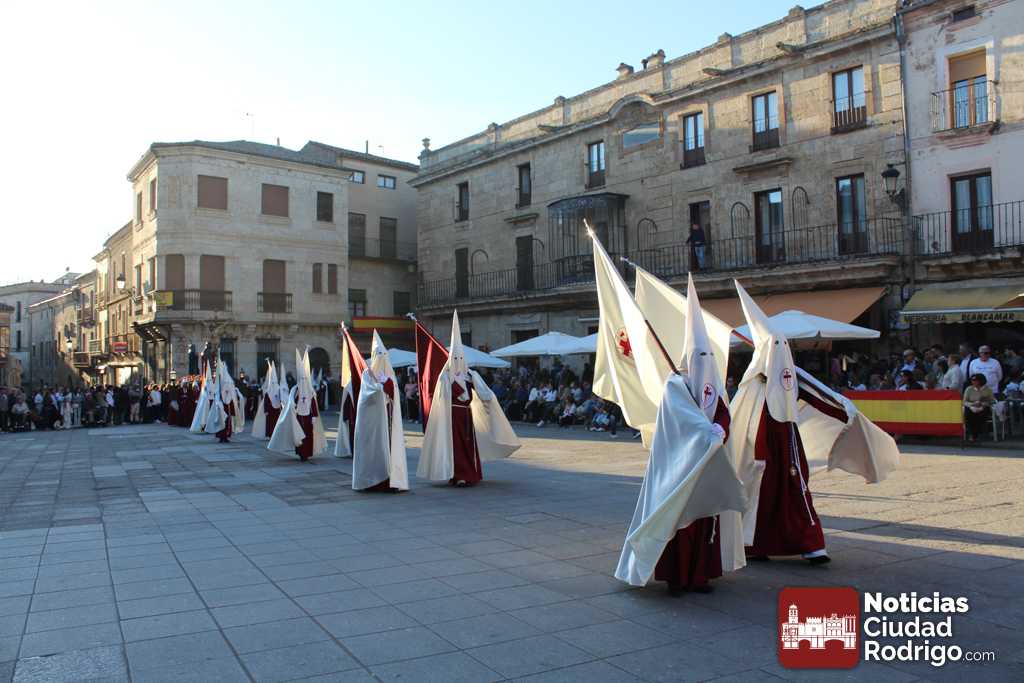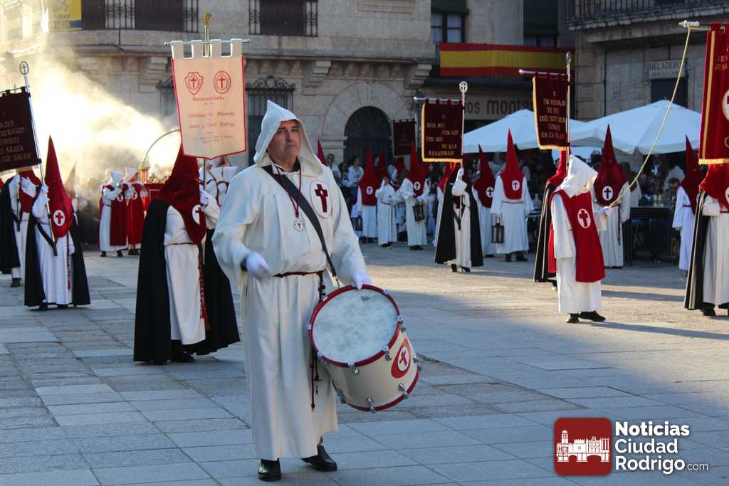 La procesión del Santo Entierro es el punto culmen de la Semana Santa en Ciudad Rodrigo. Todas las procesiones participan en este recorrido que ha comenzado a las siete de la tarde en la Catedral civitatense. La imagen de La Borriquilla acompañada por la Cofradía Jesús Amigo de los Niños ha abierto la comitiva. La cofradía de la Oración del Huerto se ha unido a la altura de Cerralbo y después de forma directa, a diferencia de años anteriores, han ido por la calle Cardenal Pacheco a la plaza Mayor.