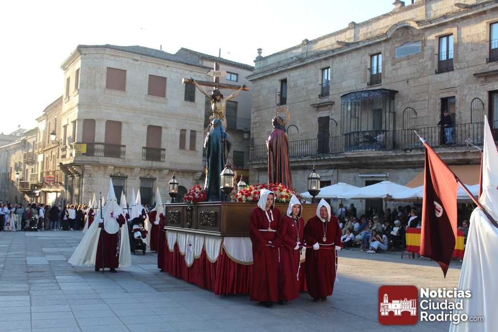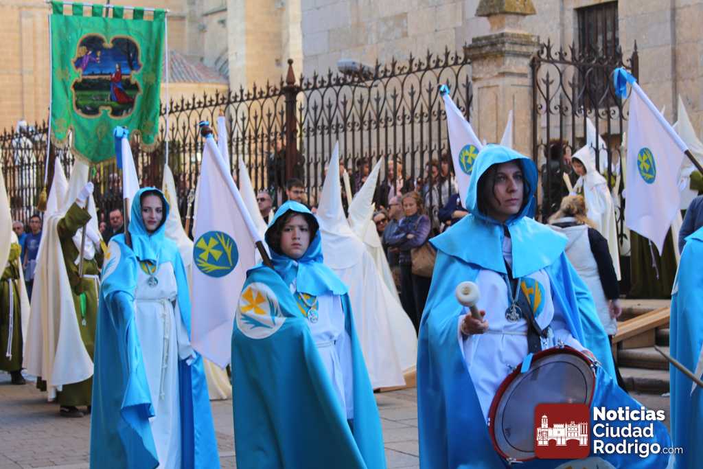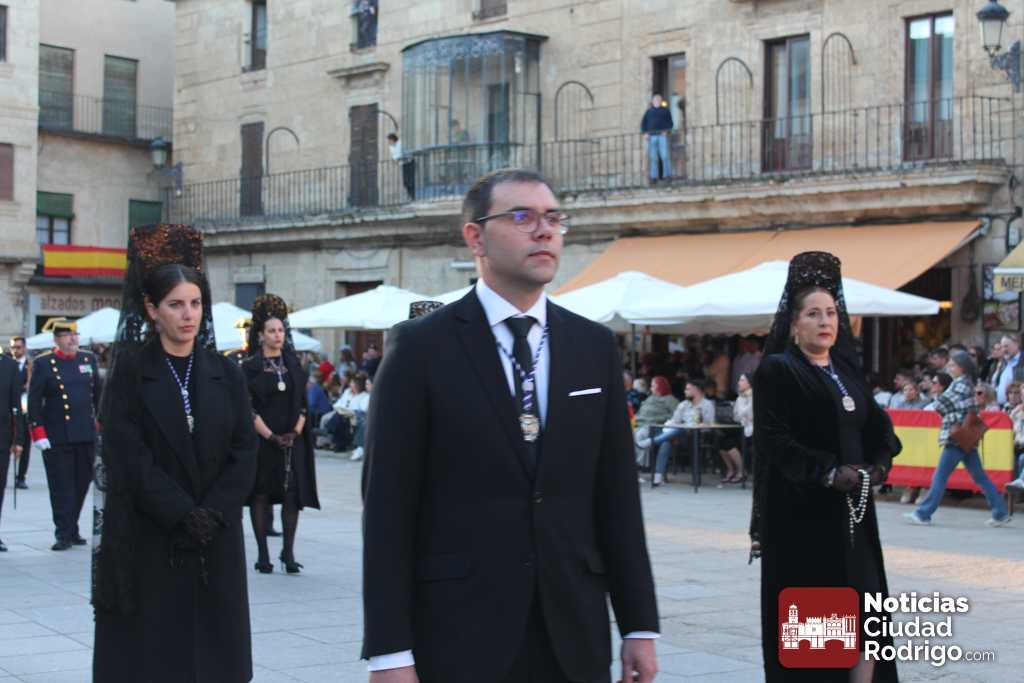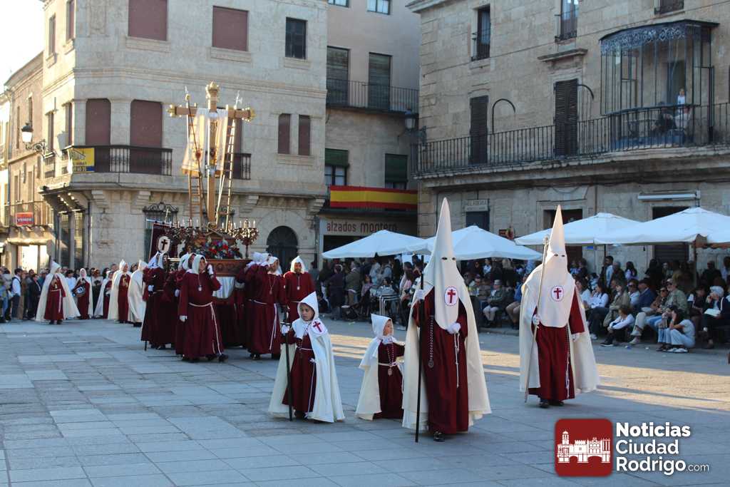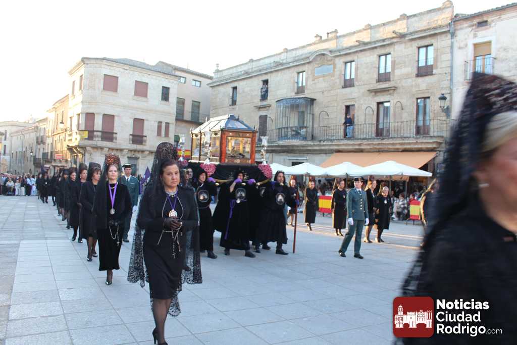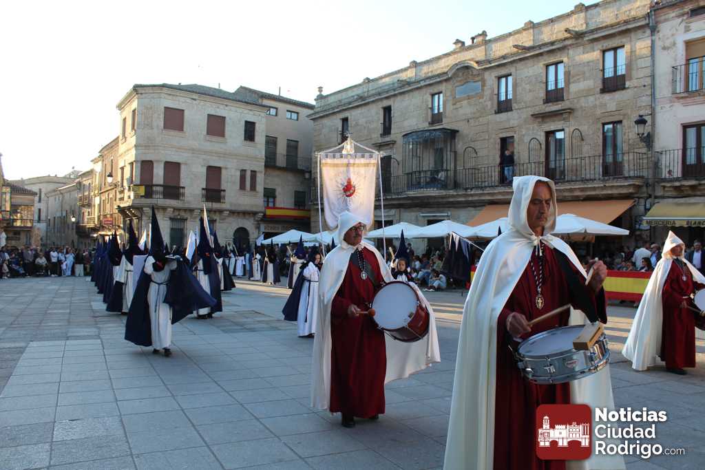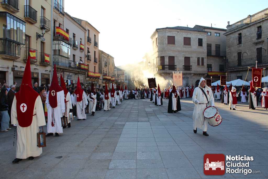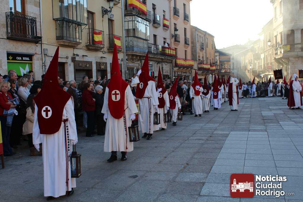 La procesión del Santo Entierro es el punto culmen de la Semana Santa en Ciudad Rodrigo. Todas las procesiones participan en este recorrido que ha comenzado a las siete de la tarde en la Catedral civitatense. La imagen de La Borriquilla acompañada por la Cofradía Jesús Amigo de los Niños ha abierto la comitiva. La cofradía de la Oración del Huerto se ha unido a la altura de Cerralbo y después de forma directa, a diferencia de años anteriores, han ido por la calle Cardenal Pacheco a la plaza Mayor.