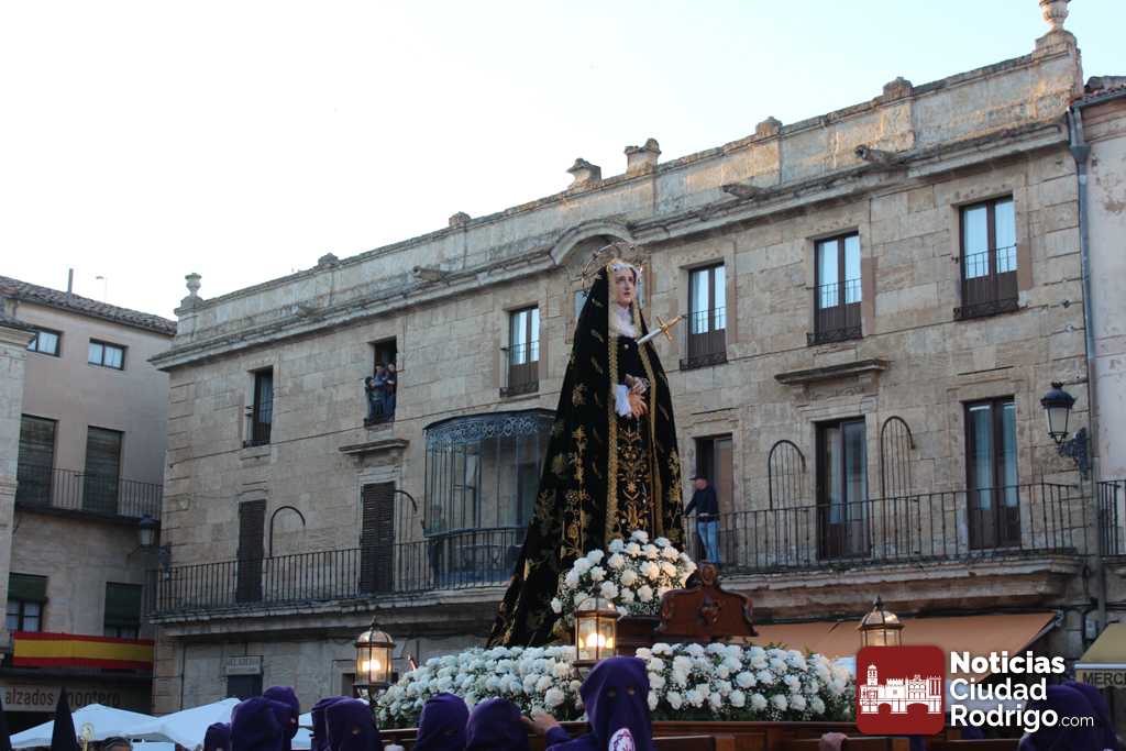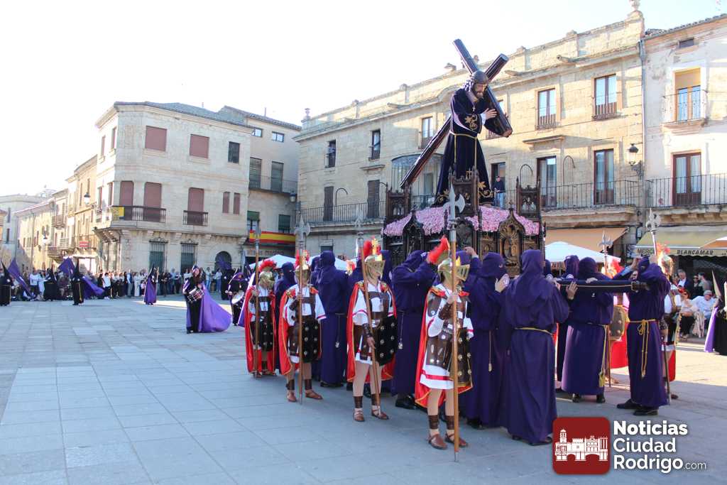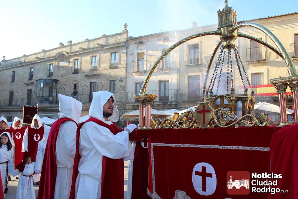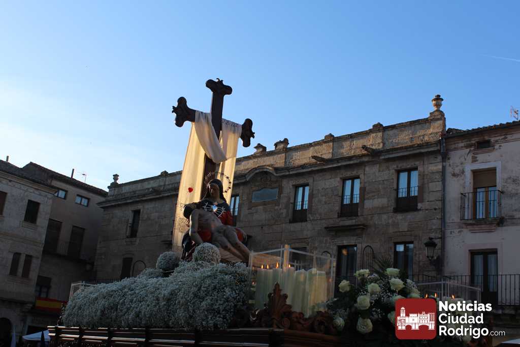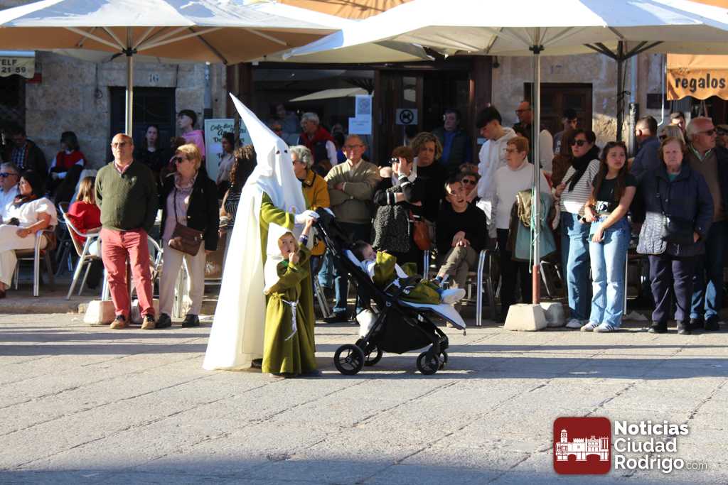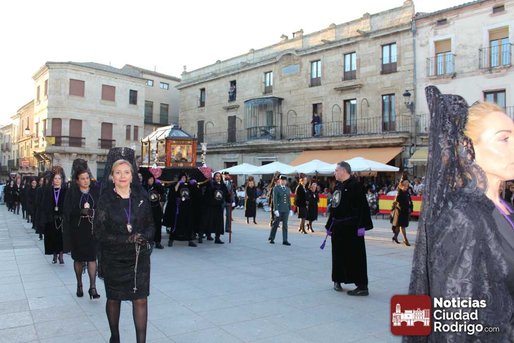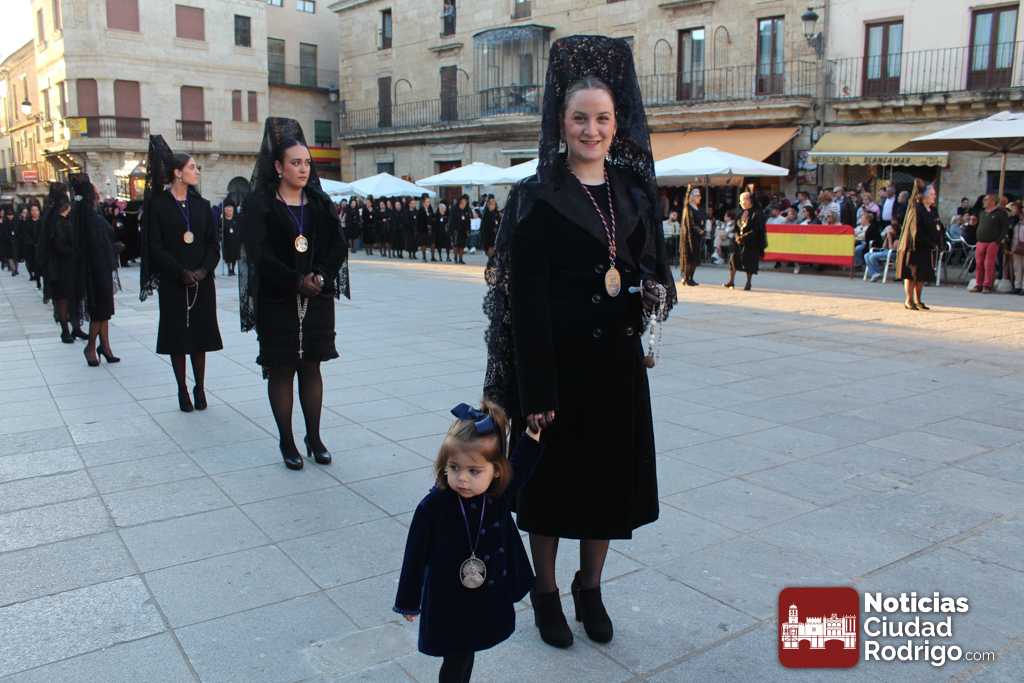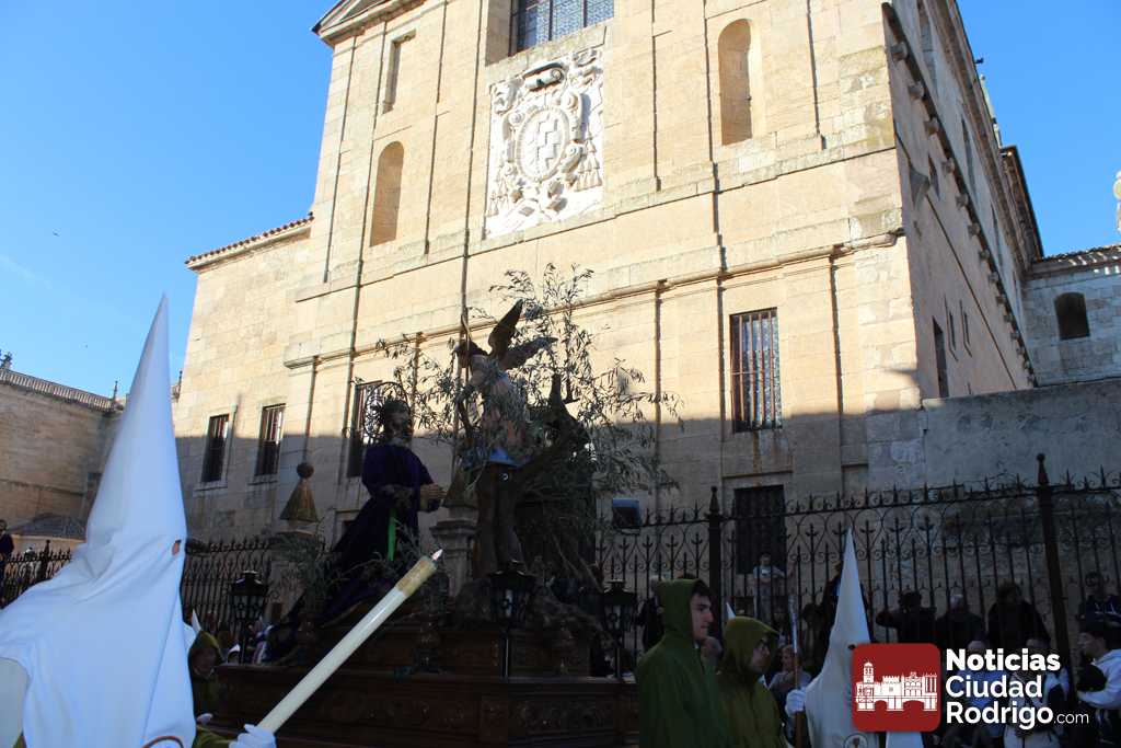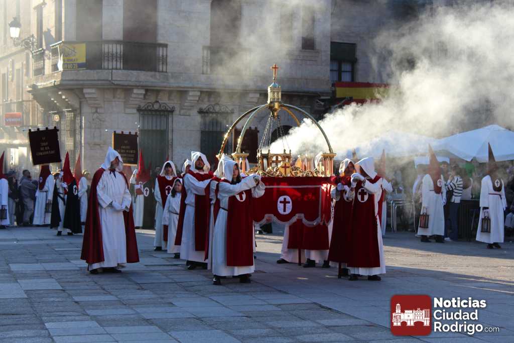 La procesión del Santo Entierro es el punto culmen de la Semana Santa en Ciudad Rodrigo. Todas las procesiones participan en este recorrido que ha comenzado a las siete de la tarde en la Catedral civitatense. La imagen de La Borriquilla acompañada por la Cofradía Jesús Amigo de los Niños ha abierto la comitiva. La cofradía de la Oración del Huerto se ha unido a la altura de Cerralbo y después de forma directa, a diferencia de años anteriores, han ido por la calle Cardenal Pacheco a la plaza Mayor.