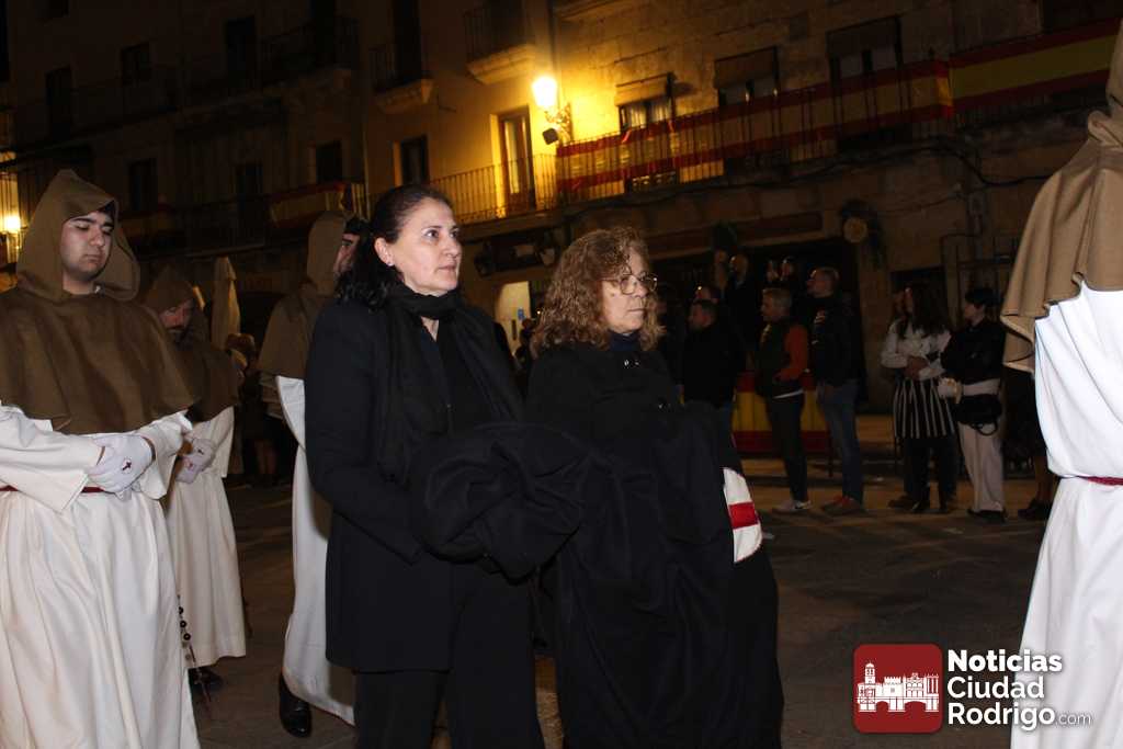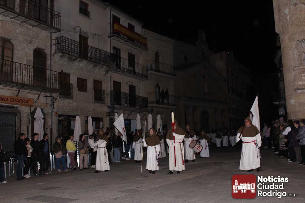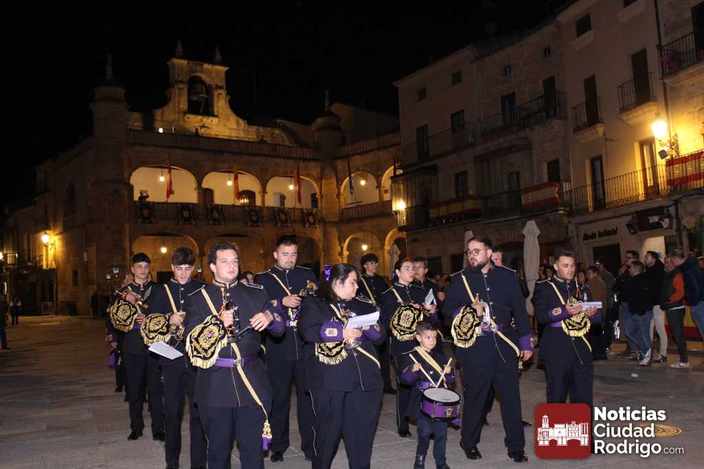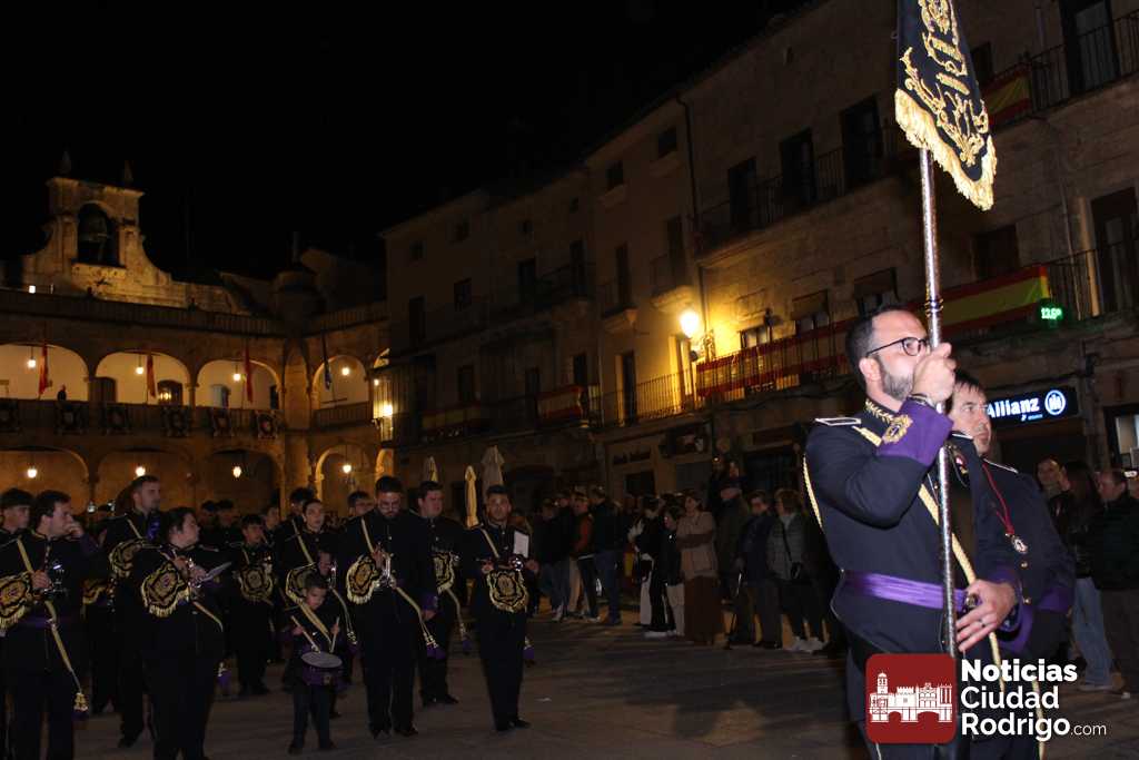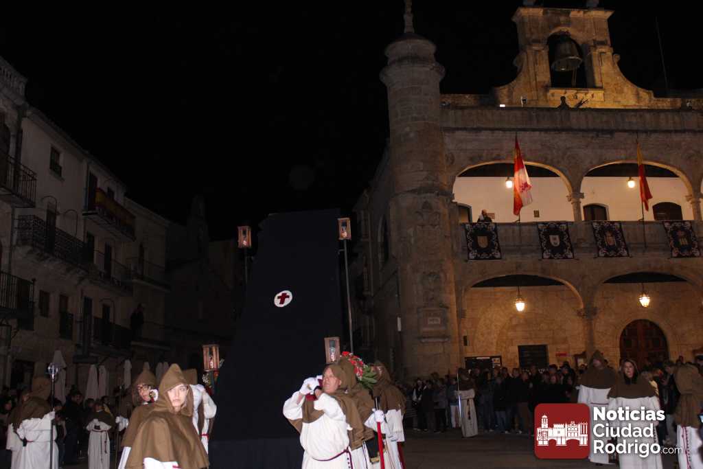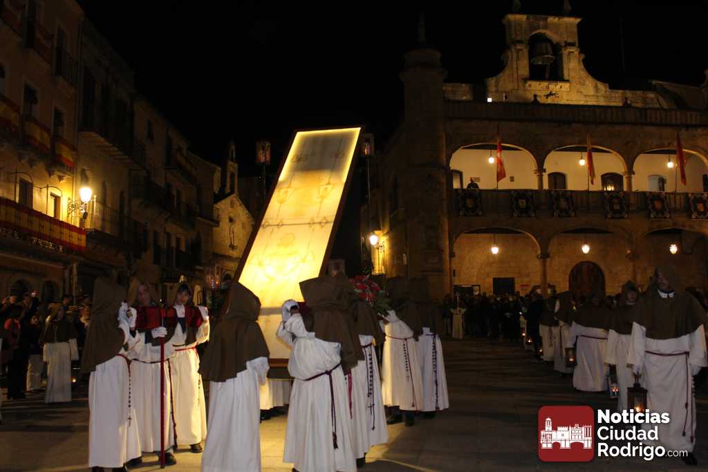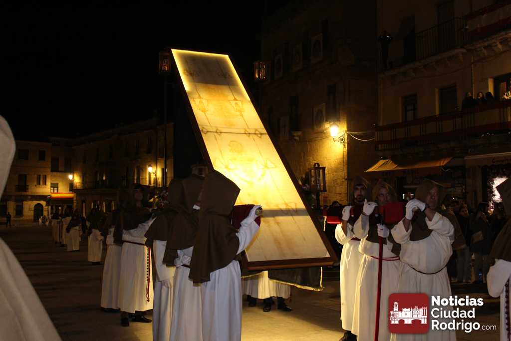 Al llegar a la plaza Mayor, la entrada de la comitiva ha estado precedida por palabras del sacerdote Juan Carlos Sánchez relacionadas con la mañana de este Domingo de Resurrección. Ya en el ágora principal de Ciudad Rodrigo, se ha descubierto la Sábana Santa que hasta el momento estaba tapada con una tela de color negro. La luz del cirio pascual abría paso y la Banda de Cornetas y Tambores «Esperanza» cerraba el recorrido. Esta banda ha comenzado a tocar cuando se ha descubierto la Sábana Santa.