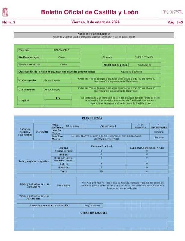 Permiso Aguas de Régimen Especial. Pesca de tenca en la provincia de Salamanca. Publicado en el BOCyL el 9 de enero de 2026. Página 345. Puedes leerlo aquí: