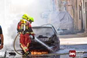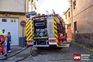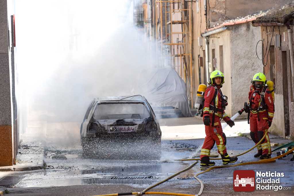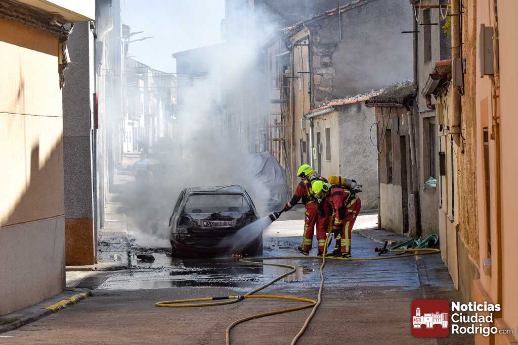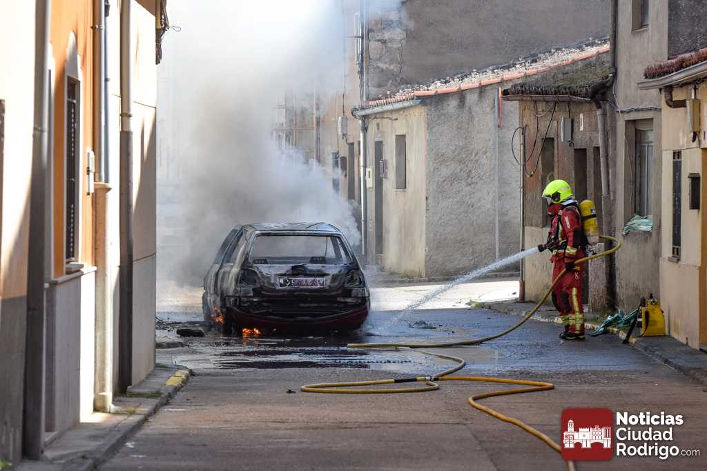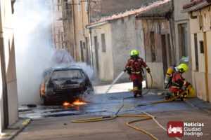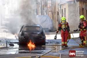 Segundo vehículo ardiendo en Ciudad Rodrigo en tan solo una mañana. Dos camiones de bomberos, Policía Local y Guardia Civil, acudieron durante esta mañana a un nuevo incendio en las calles mirobrigenses, concretamente en la calle José María del Hierro, conocida popularmente como «Calle de los Judíos».